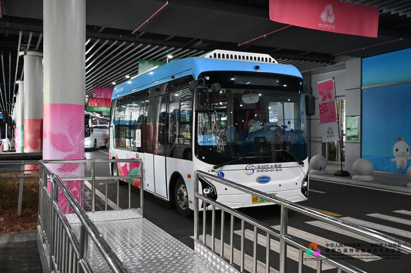 在深圳市体育中心一侧的专用停车区,有一列标有“无障碍接驳车”字样的中巴静静停靠。车门处,液压升降平台平稳落地,志愿者推着轮椅运动员缓缓上车,驾驶员俯身确认轮椅锁扣牢固,一切井然有序、无声却有力。这里是残特奥会福田赛区的交通保障现场,也是城市温情的生动注脚。
