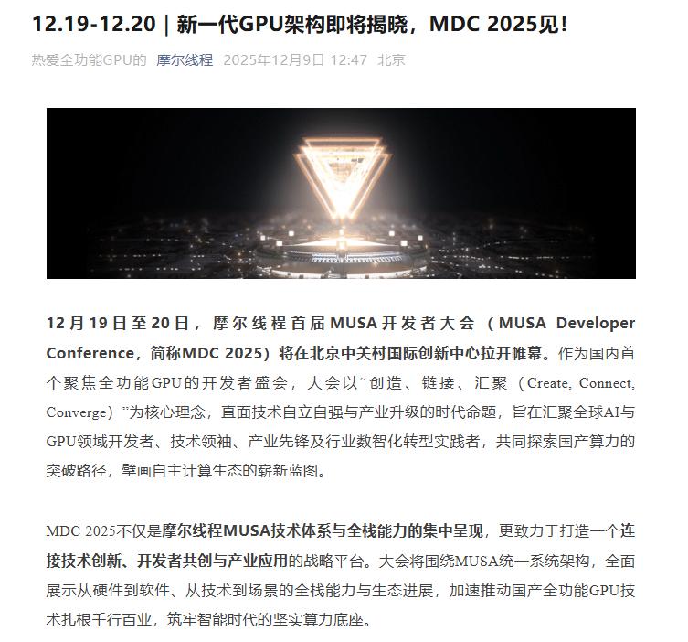 作为“国产GPU第一股”,摩尔线程近期动作频频。12月19日至20日,摩尔线程首届MUSA开发者大会将在北京中关村国际创新中心拉开帷幕。