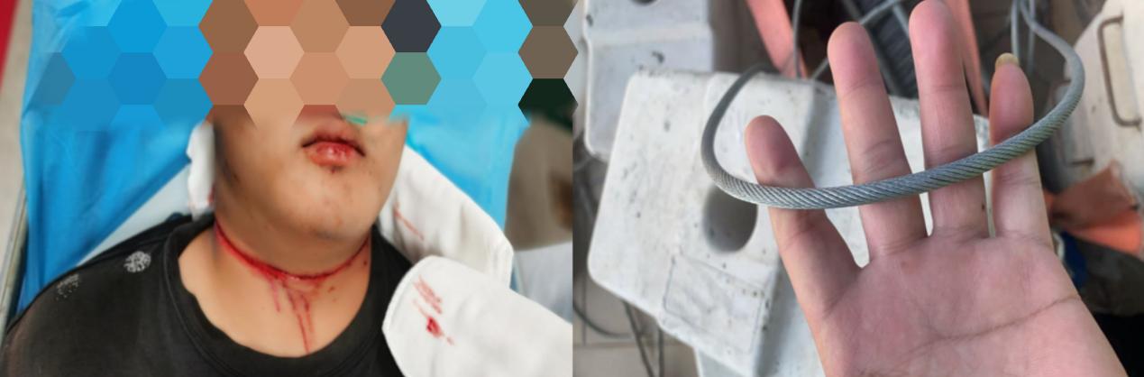 11月22日16时30分,一处高空作业现场突发险情。一根直径约小指粗的钢丝绳在作业中突然断裂,带着巨大惯性甩向一旁18岁的工人小李,瞬间紧紧缠绕住他的颈部并持续绞勒约30秒。工友奋力将绳索解开时,小李已面色青紫,张口呼吸却难以发声,呼吸声粗粝急促,颈部可见明显环形勒痕并迅速肿胀。