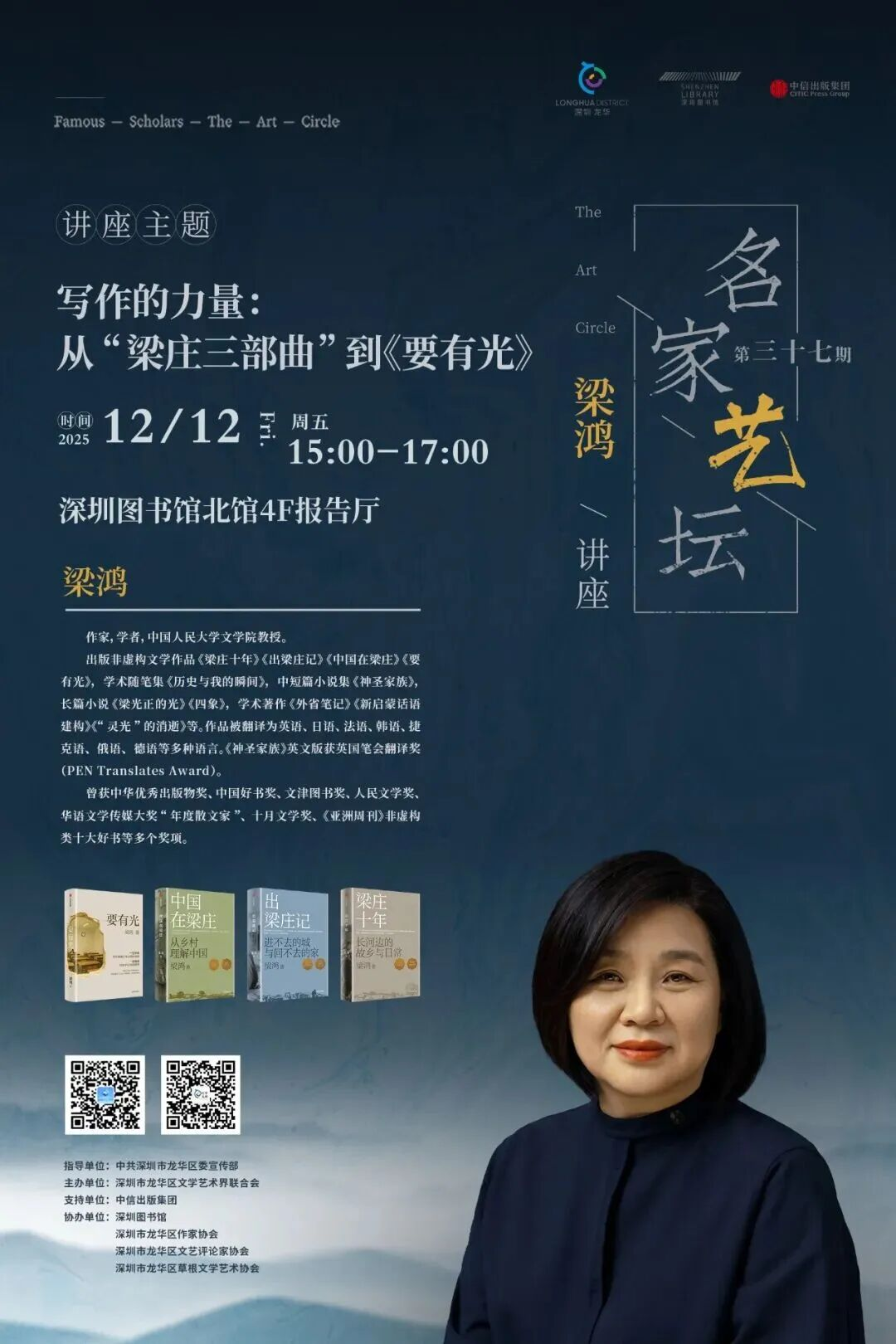 第37期“名家艺坛”活动,龙华区文联特邀著名作家、学者、中国人民大学文学院教授梁鸿,带来《写作的力量:从“梁庄三部曲”到〈要有光〉》主题分享。梁鸿教授会围绕“梁庄三部曲”(《中国在梁庄》《出梁庄记》《梁庄十年》)与《要有光》的创作故事展开,从深耕乡土叙事到回应时代命题,从温情书写个体命运到深度表达社会观察,分享文字穿越时空的共情力与人文分量。