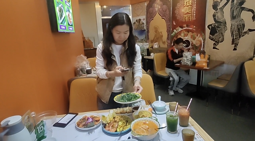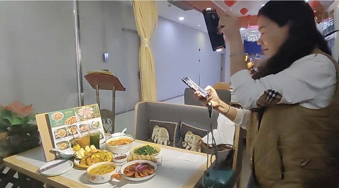 8日中午,在东门这家泰国风味餐厅,李雪梅对着店家外观环境、菜品全景拍完之后,坐下来,左手拿起手机又开拍。她右手用勺子舀了菠萝炒饭,手腕翻转,粒粒分明的炒饭和里面的菠萝丁在手机镜头前呈现得相当全面。她还请记者帮忙,拿起一杯饮料,拍了一个碰杯的镜头。