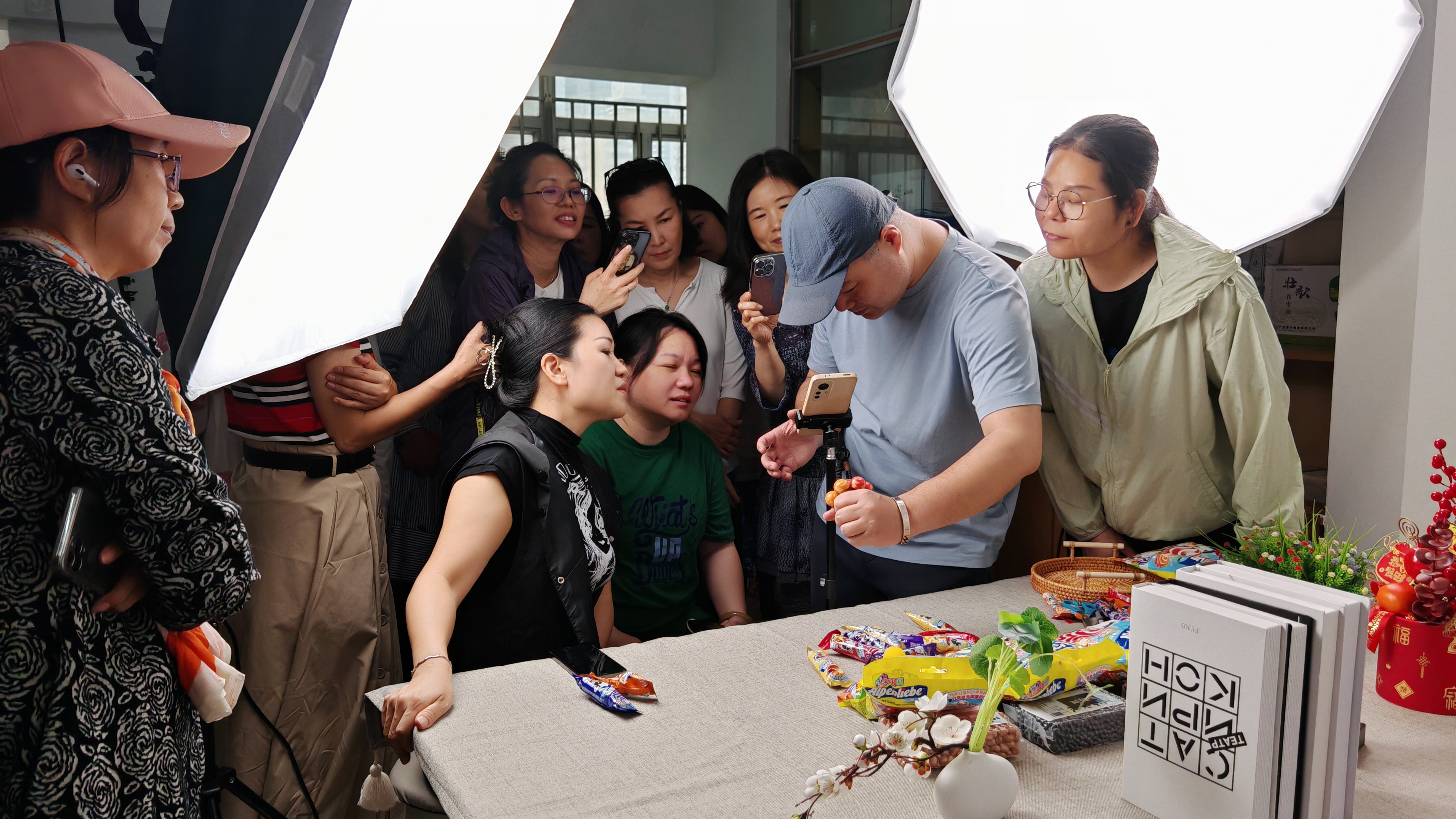 8日当天,罗湖社区“全职妈妈主理人”莫雅媛带记者走进了位于广东省银行大厦的一间政府物业,这个两房一厅里,各类灯光、主播台设置齐备,一侧摆满了产品,还有长条会议桌,这里是“深港妈妈帮共享直播间”,也是她们聚会、分享交流,举办各类活动的地方。