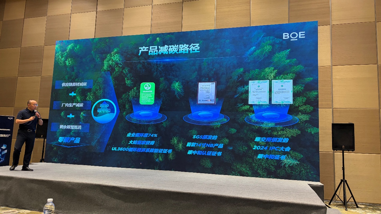 在开放合作领域,京东方依托“技术+品牌”双价值驱动,深化与全球高端品牌的合作,发掘创新合作模式。与一加手机联合打造的东方屏3.0,凭借全球首款原生165Hz超高刷新率,将手机屏幕带入超高刷时代;与联想合作发布高端商用显示器ThinkVision P系列新品,以独供Oxide氧化物技术树立行业新标杆。在可持续发展领域,京东方搭建绿色发展平台,试点打造 “零碳产品”,通过上游供应链原材减碳、厂内生产减碳、剩余碳量抵消等举措,实现NB显示面板综合碳排放为零,获绿交所碳中和证书,助力生态链绿色转型。