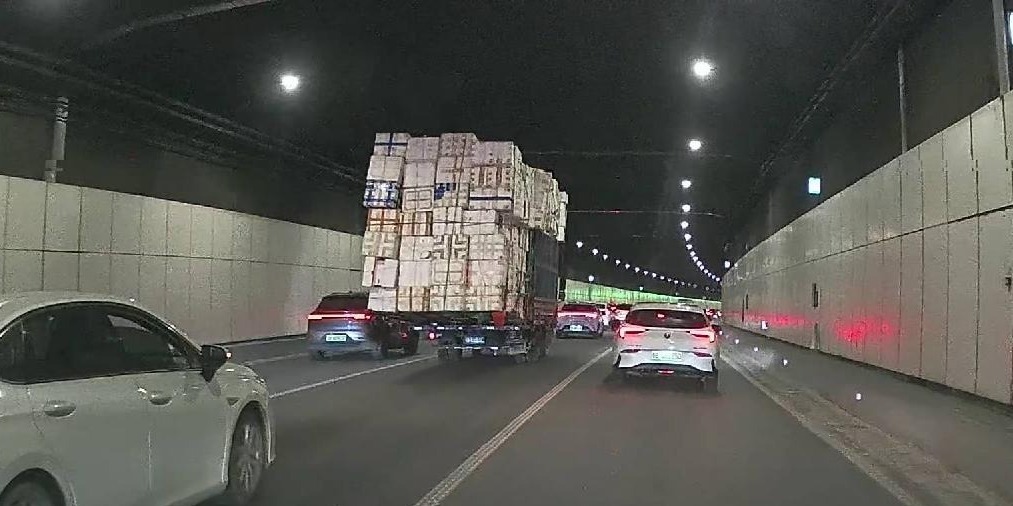 隧道里车流密集缓行,一辆超长、超宽、超高,满载泡沫箱的货车晃晃悠悠地行驶在中间车道,令人触目惊心。这是12月11日晚高峰时段,深晚记者在丹平快速九尾岭隧道南往北方向直击到的一幕。