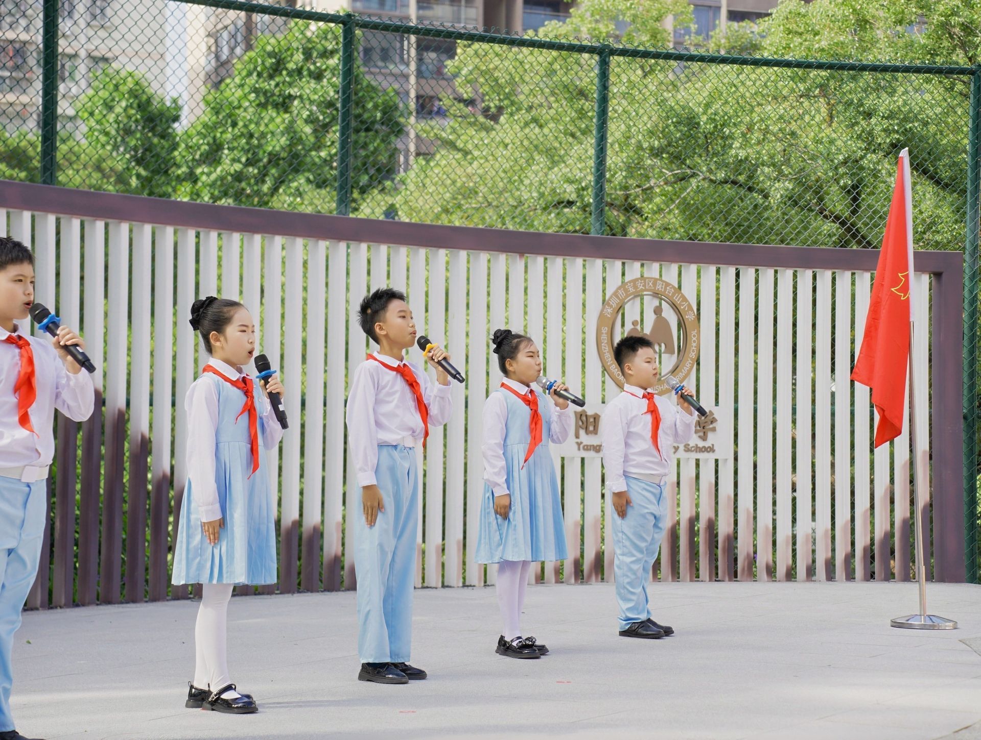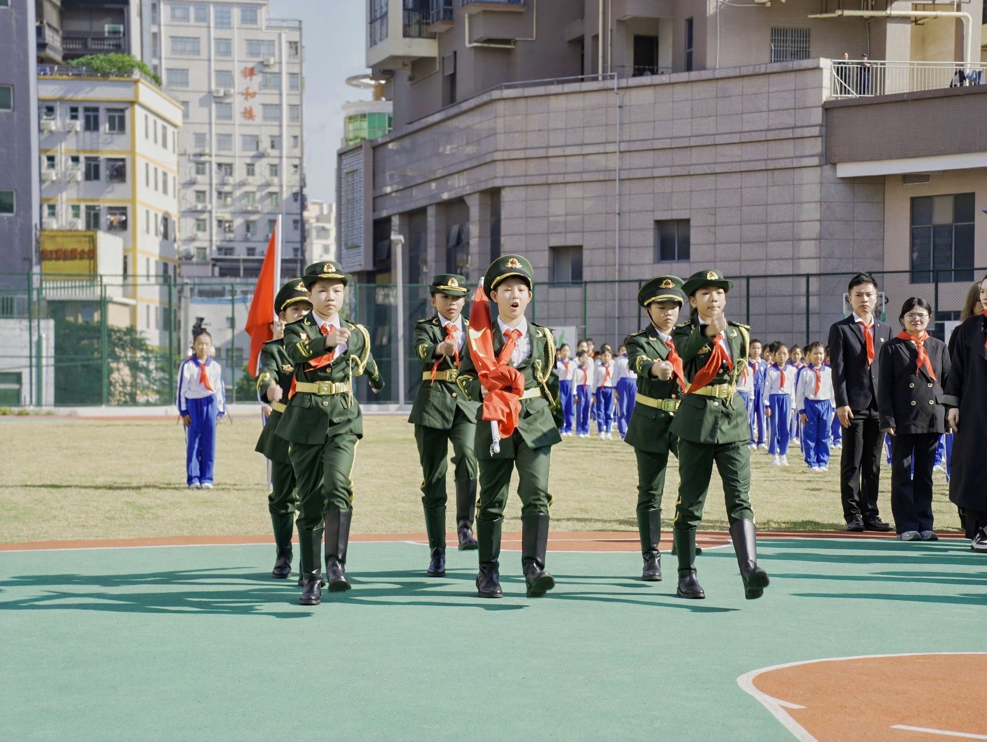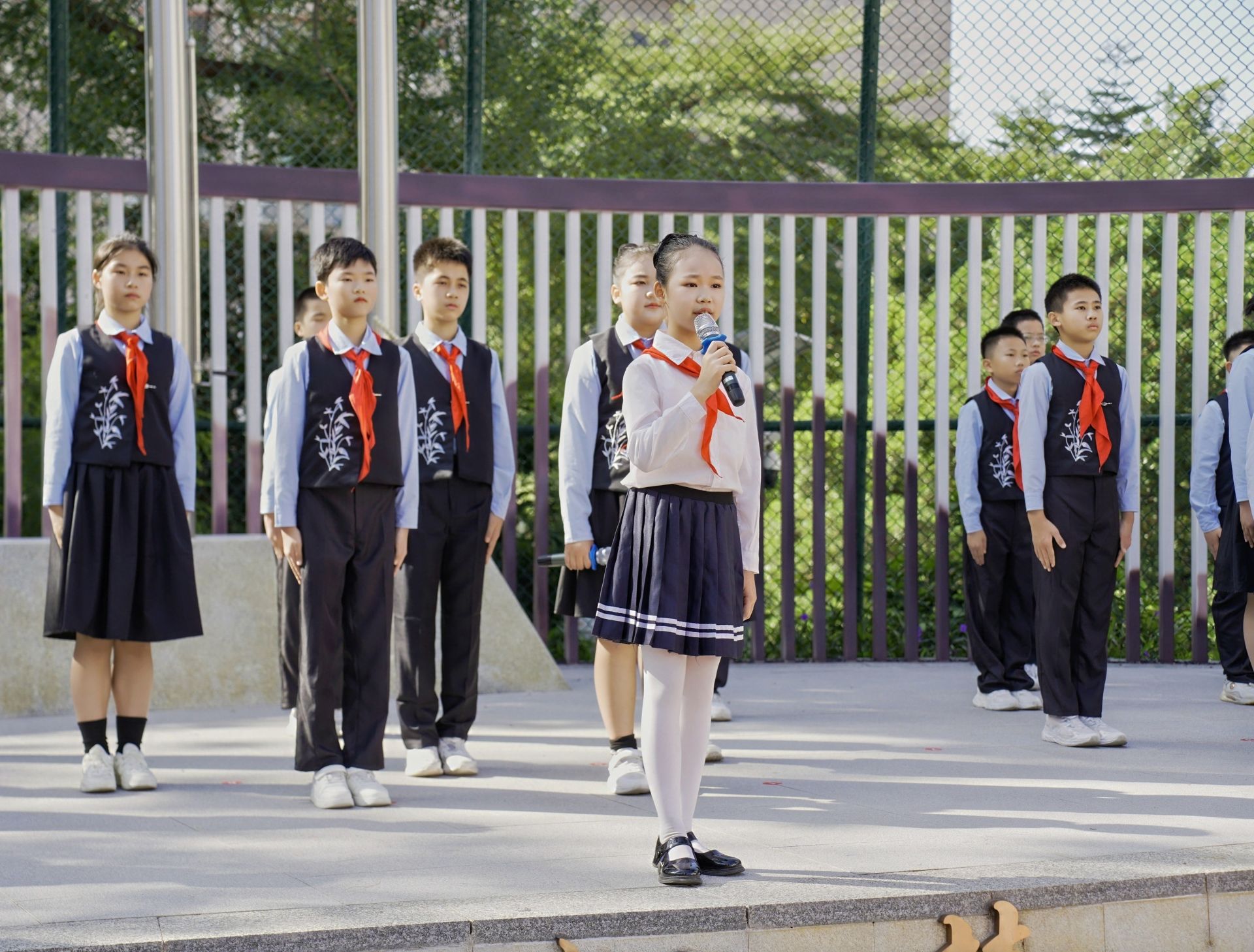 活动在庄严的升旗仪式中开启,全体人员高唱国歌。伴随着出队旗的雄壮旋律,少先队员们以稚嫩而坚定的声音唱响《我们是共产主义接班人》,队歌响彻校园。
