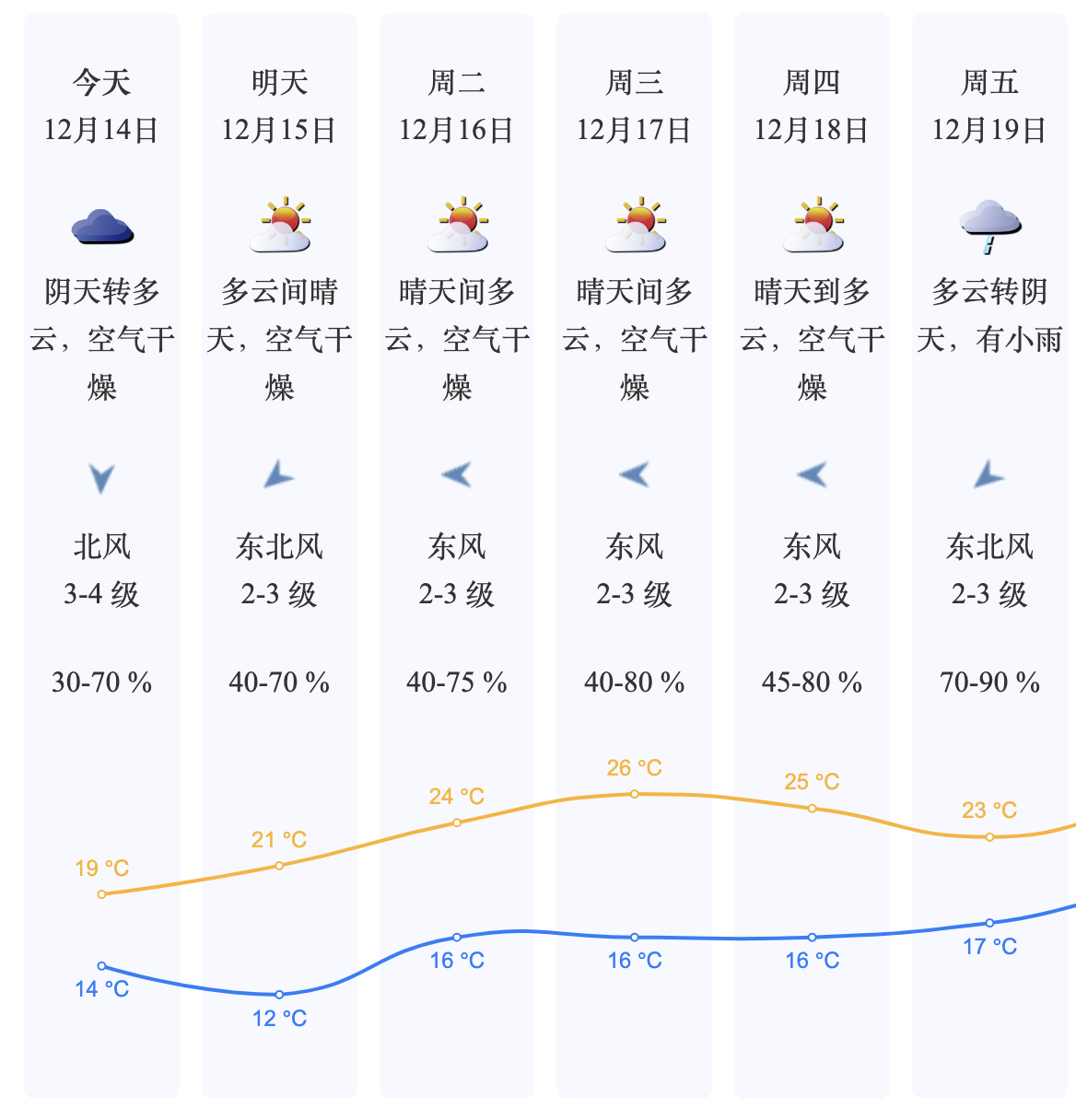 12月14日白天,天气将渐转多云,风力逐渐减弱,气温在13-19℃之间,空气也随之转干。