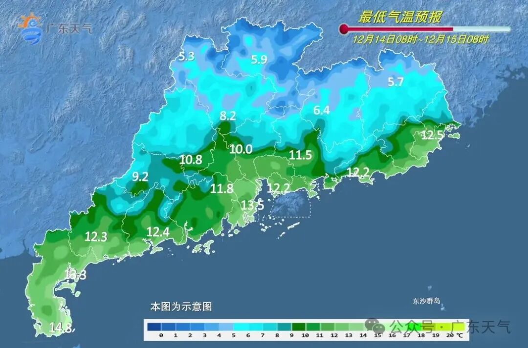 放眼全省,这股中等偏强冷空气威力不容小觑。过程最低气温将出现在14日或15日早晨:粤北和珠三角北部最低气温仅3-7℃,部分市县跌破5℃,高海拔山区更是低至0℃左右,局部有霜(冰)冻;南部沿海市县也降至13-15℃。