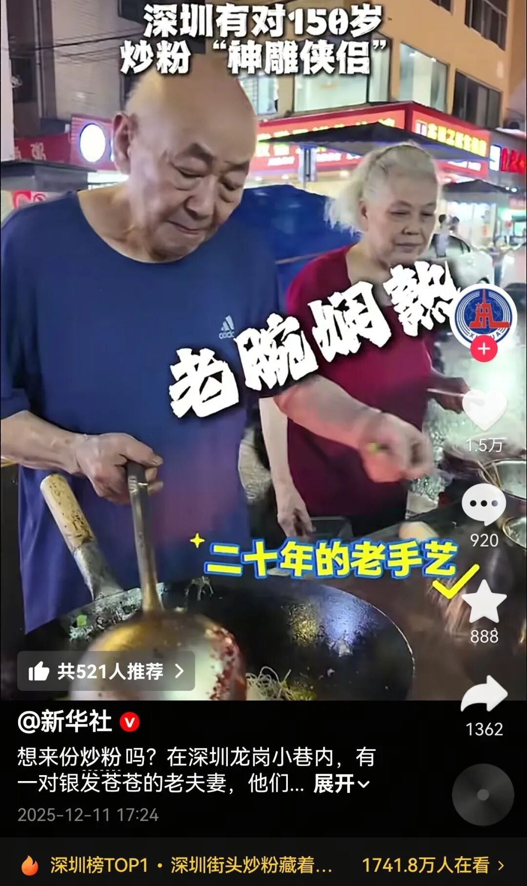 近日,在深圳龙岗布吉老街的深夜,一对老夫妻与他们的小摊烟火,又一次亮彻网络,温暖了无数人的夜晚。77岁的黄爷爷与73岁的何奶奶,年龄相加恰好150岁,被网友亲切称为“炒粉神雕侠侣”——他们用一口铁锅、一柄锅铲,在街头坚守20余年,将生活的踏实与对家人的牵挂,都炒进了每份十元的炒粉里。