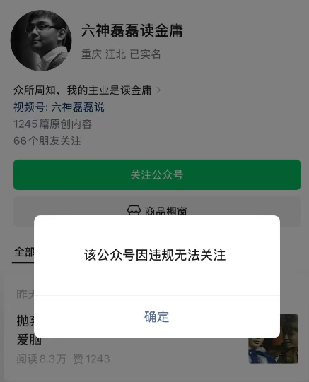 12月14日中午,有媒体报道,微信公众号“六神磊磊读金庸”因违规无法关注。检索发现,“六神磊磊”相关视频号仍可正常关注,微博、抖音也可正常关注。当事人的另一个微信公众号“六神磊磊读唐诗”也显示正常。但上述相关账号均尚未对微信公众号被禁止关注一事作出解释。