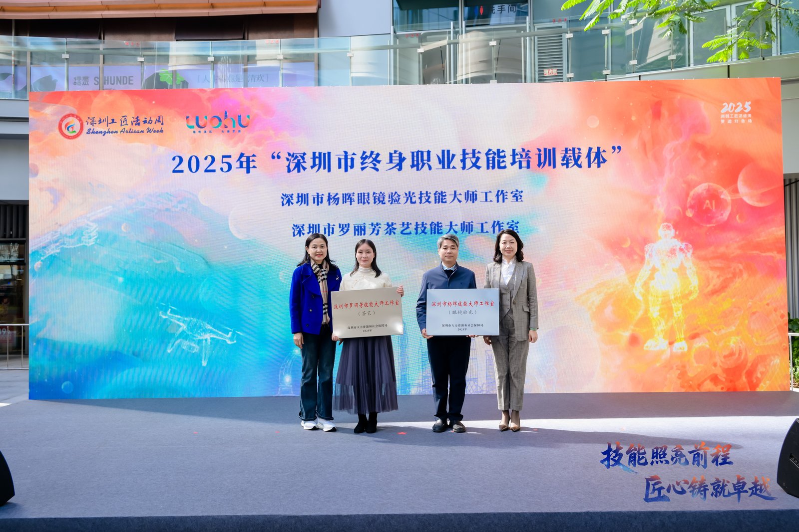 当天,赵伟利、虞波、雷强、赖院森、张俊立五名新获评的“罗湖工匠”接过象征荣耀与认可的证书,深圳市甘露珠宝首饰有限公司、周六福珠宝股份有限公司、深圳市罗丽芳茶艺技能大师工作室、深圳市杨晖眼镜验光大师工作室四家在技能传承与创新中表现突出的培训载体也获得正式授牌。
