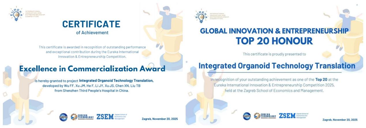 近日,深圳市第三人民医院生物治疗中心在国际创新创业赛事中斩获佳绩。在2025年第八届优瑞卡国际创新创业大赛(Eureka International Innovation and Entrepreneurship Competition,IIEC 2025)上,深圳市三医院吴芬芳教授团队凭借“复合类器官技术转化”项目,从全球近200支参赛团队中脱颖而出,荣获“最具商业转化价值奖”,位列全球前20,这一成绩标志着三院在类器官领域的原创性探索获得了国际认可。
