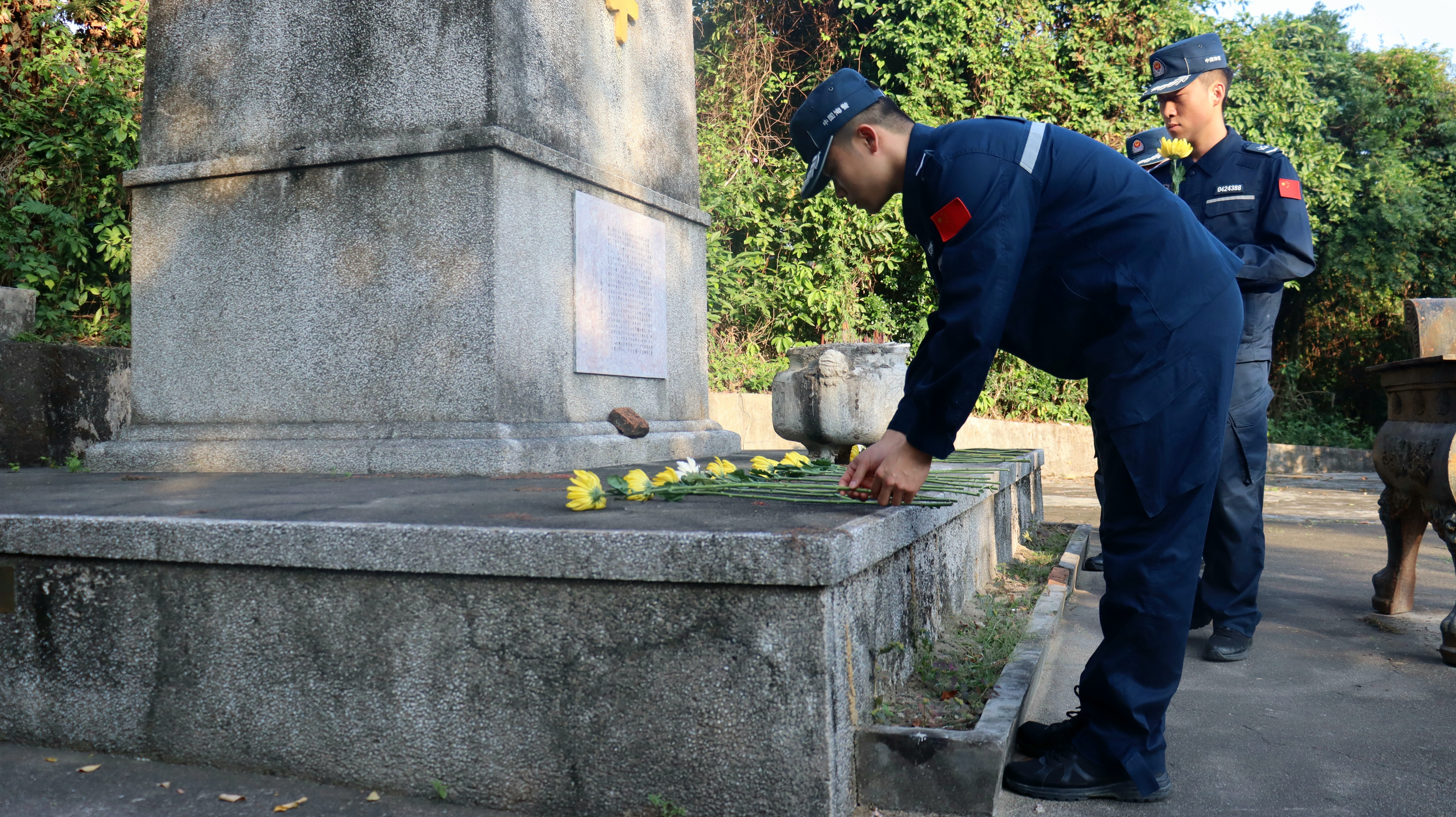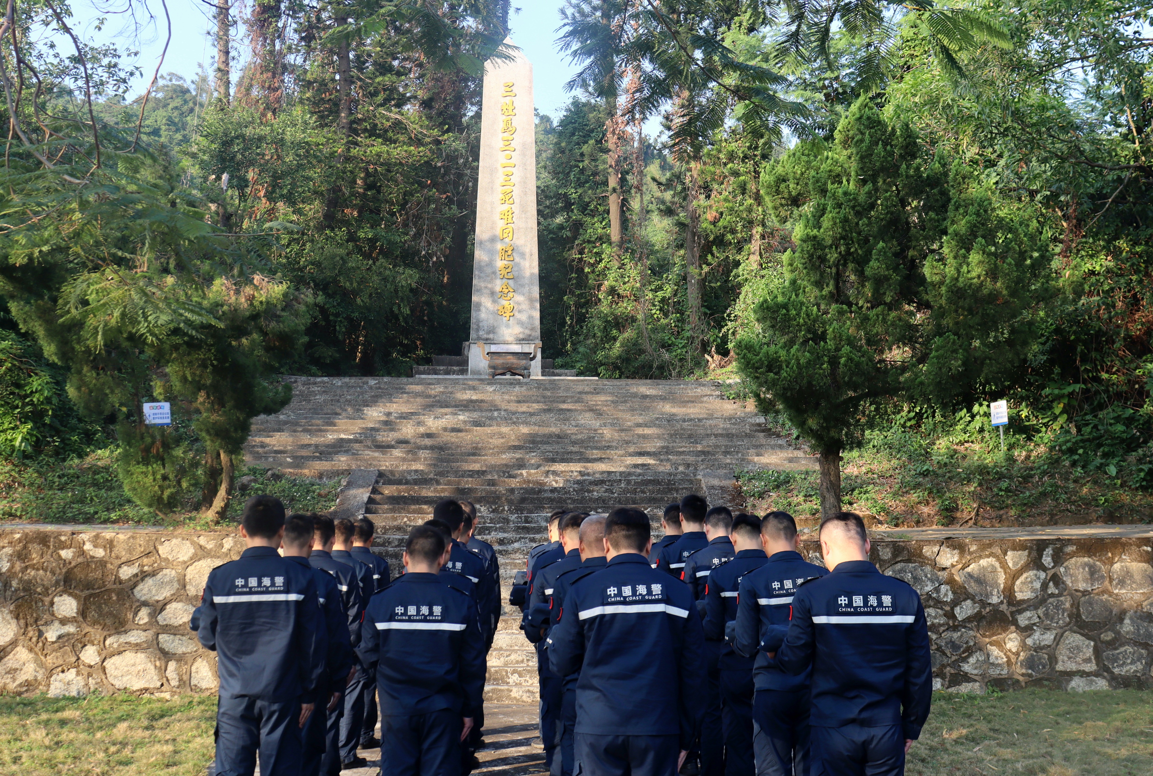 三灶岛侵华日军罪行遗迹松柏凝翠、气氛肃穆,珠海海警局执法员们在三灶岛“三·一三”遇难同胞纪念碑前整齐列队,脱帽肃立,默哀致敬,深切悼念在侵华战争中惨遭杀戮的革命先烈和死难同胞。