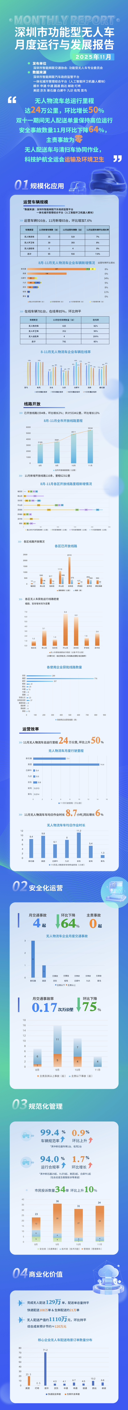 2025年11月,在“双十一”物流高峰与十五运会服务保障的双重推动下,深圳市功能型无人车产业迎来规模化、安全化、高效化发展的新里程碑。最新月度运行数据显示,行业运营规模再创新高,安全水平显著提升,场景创新与生态构建步伐持续加快。