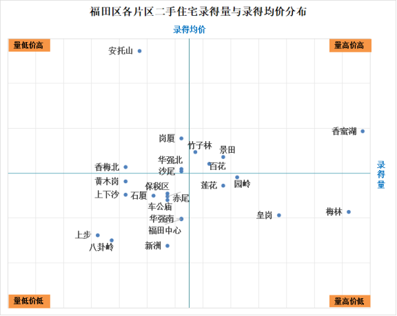 二手房交易数据显示,上周深圳城市价值亮点为:福田区香蜜湖、景田、竹子林和百花片区抗风险性强。深圳市房地产中介协会根据福田区“二手买卖”录得合同数据,选取二手住宅录得量及录得均价两项指标,通过均值偏离度分析,绘制出福田片区分布四象限图。该图可直观呈现各片区相对于福田整体均值的偏离程度,有助于初步评估各片区价值。