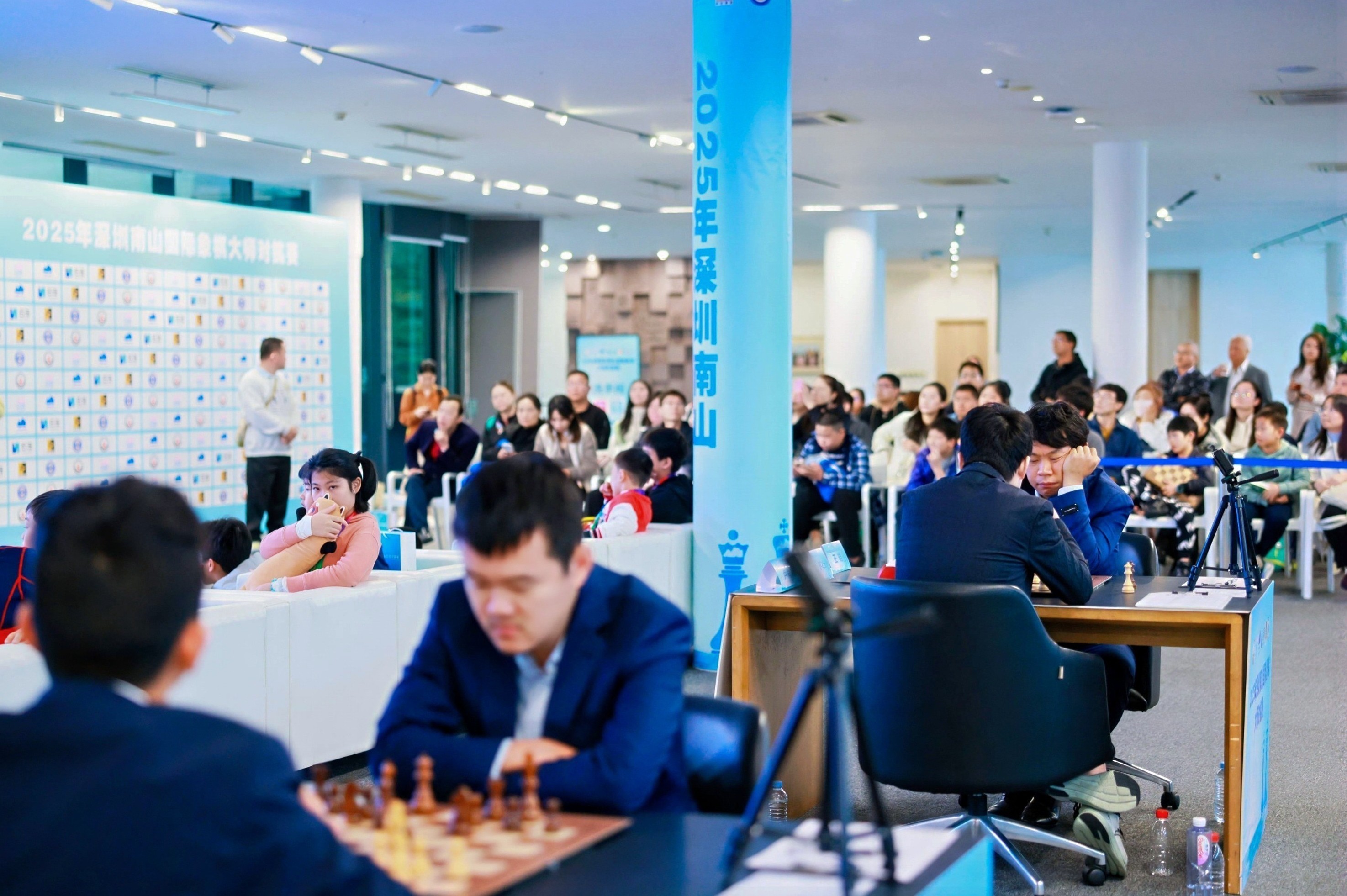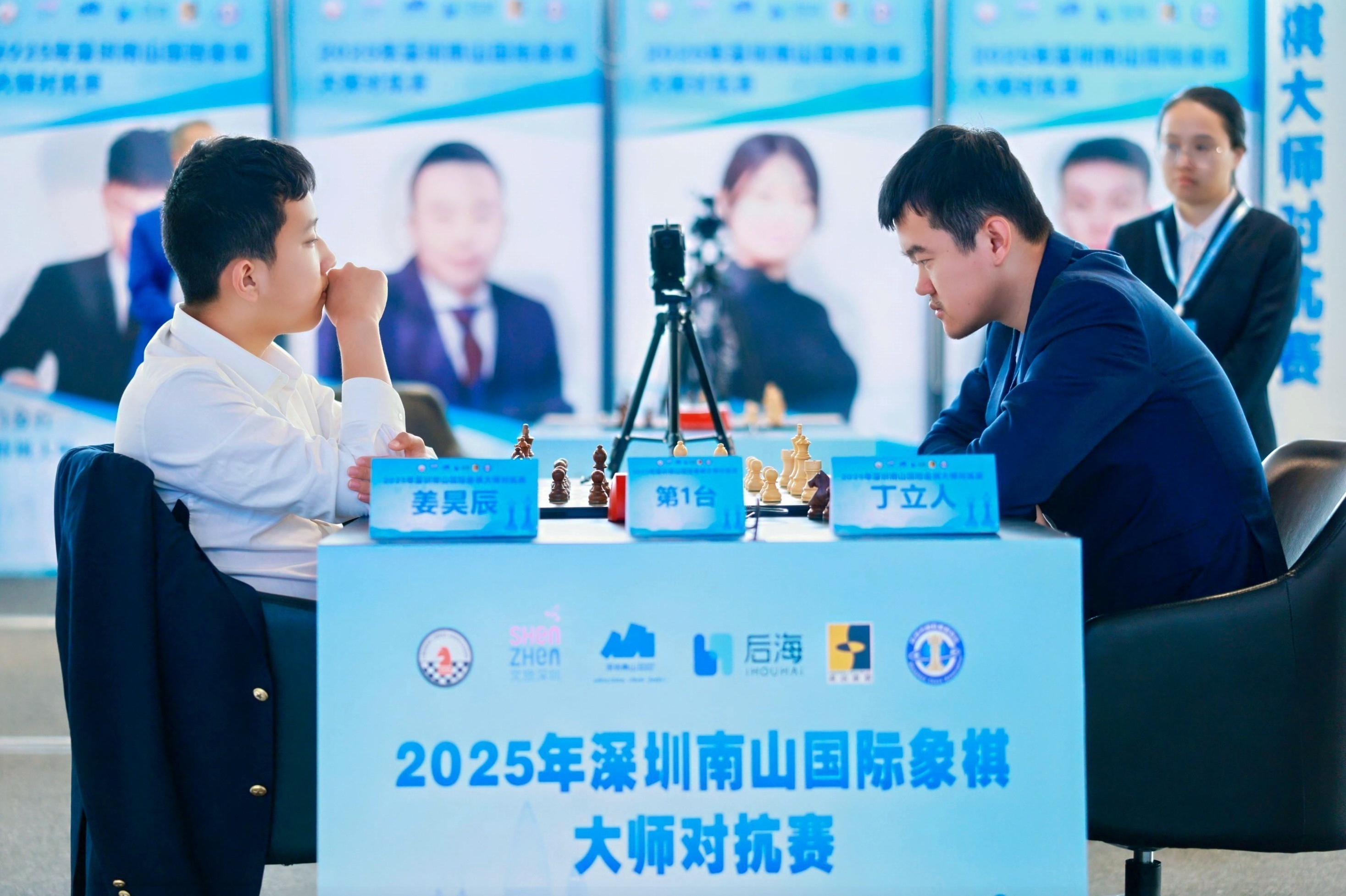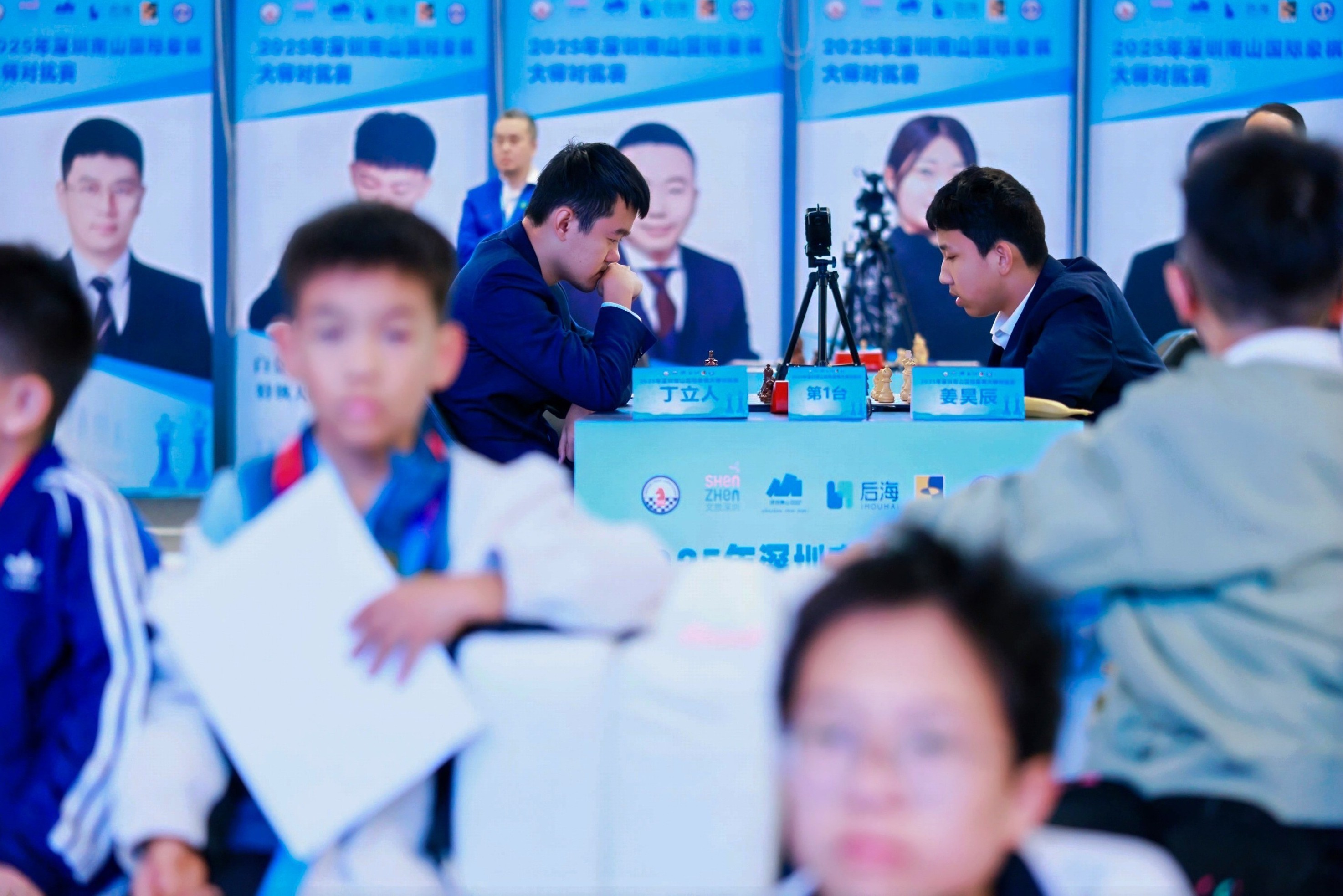 大屏幕上,世界冠军丁立人与14岁深圳小将姜昊辰的快棋对决正悄然推进,这是2025深圳南山国际象棋大师对抗赛的现场。当世界冠军最终锁定胜局、晋级决赛,安静的观赛区忽然响起掌声——起初零星,随即连成一片,持续良久。