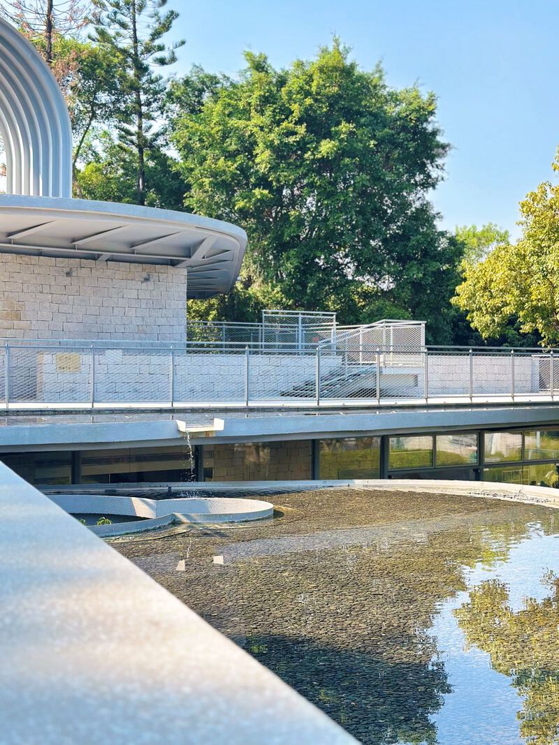 问山叠水作为绿道的起点,是9大节点中不可错过的打卡地。其驿站建筑极具设计感,多片薄水面屋顶层层堆叠,流水自高处逐级跌落,溅起细碎水花,如同一个个音符在屋顶跳跃。