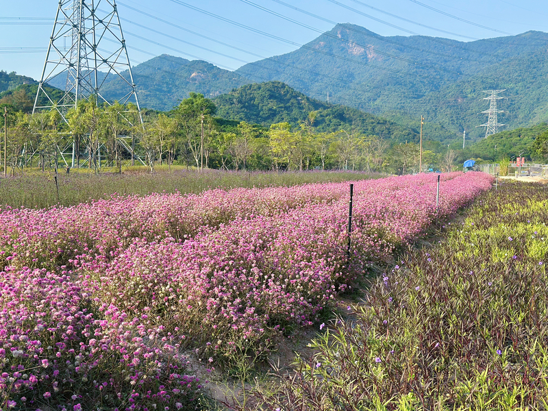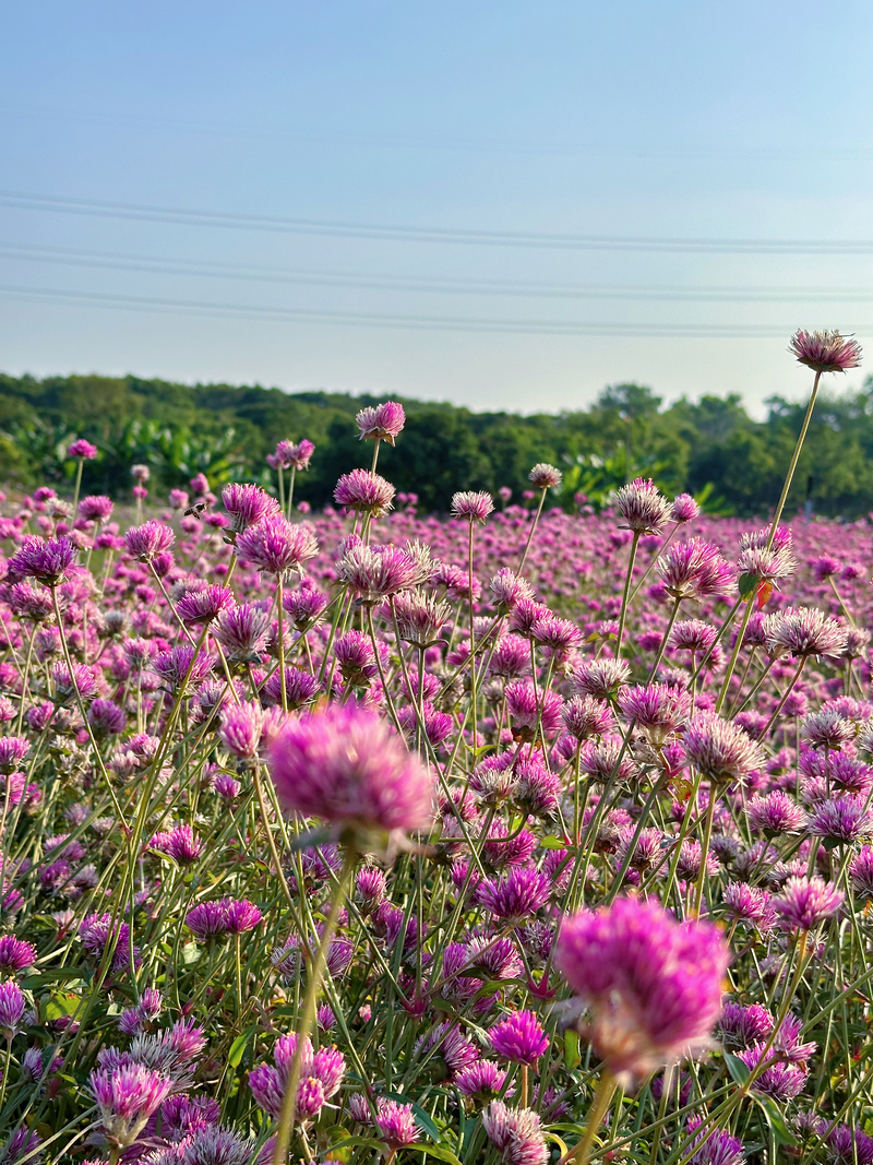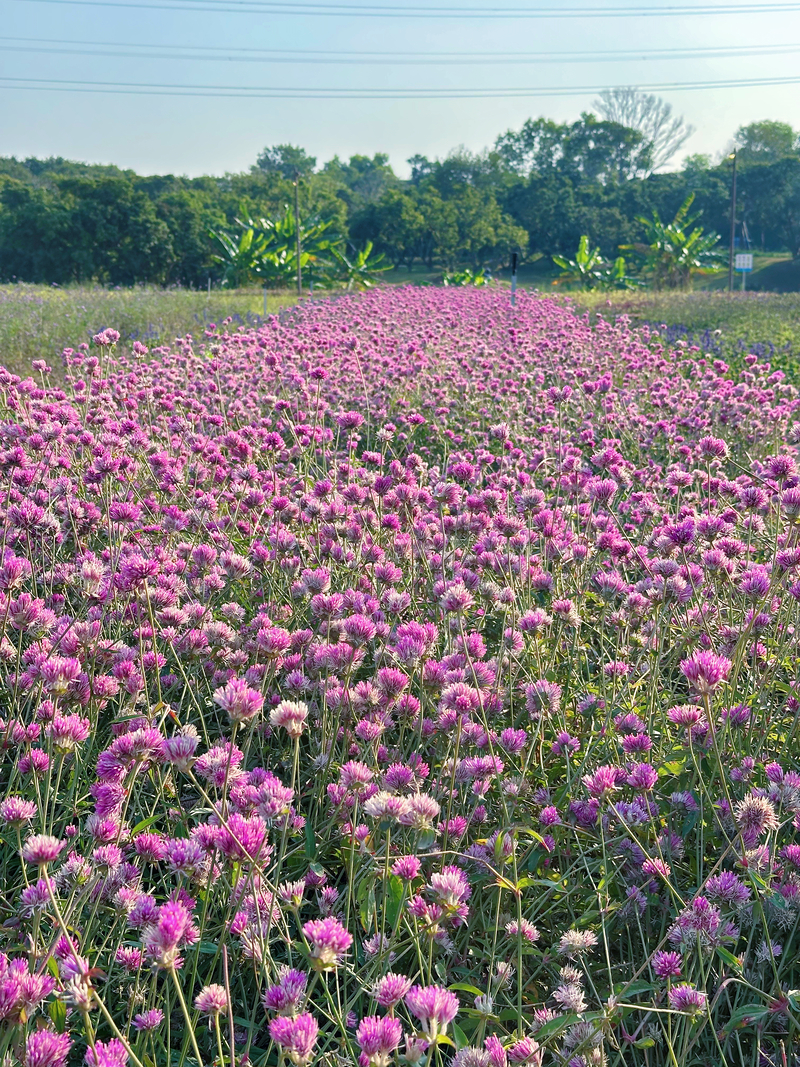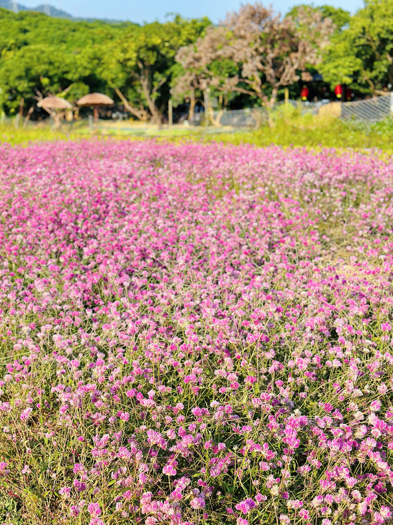 与落羽杉隔河相望的,是一片广袤的花田。初秋时节,千日红、鼠尾草、马鞭草竞相开放。粉、紫、黄、白等色彩交织碰撞,犹如调色盘被打翻,尽情挥洒着秋天的绚烂与明艳 ,使人仿佛置身于浪漫的童话世界。