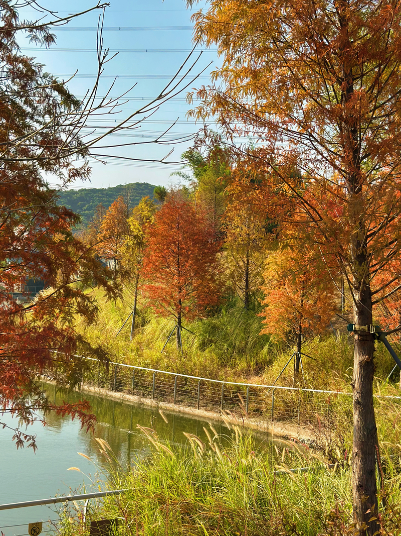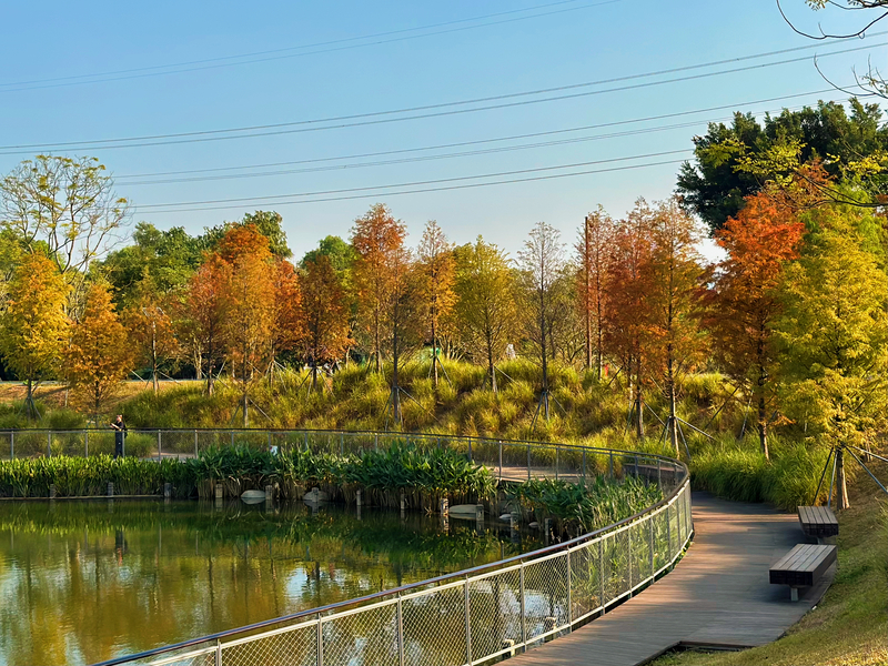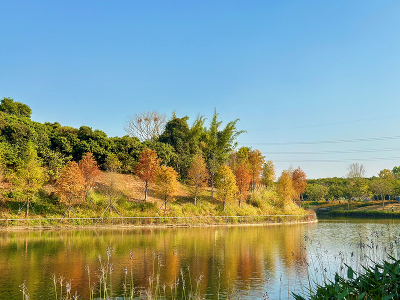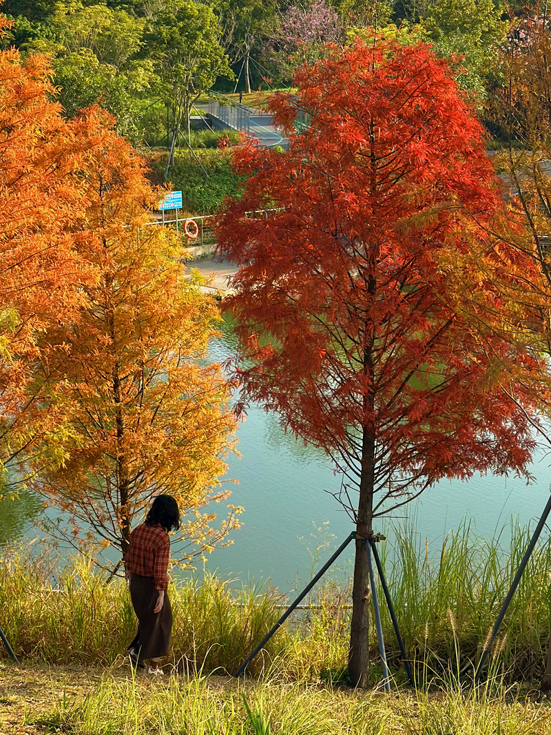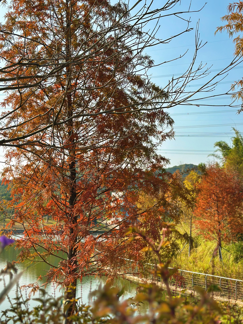 在环西丽湖绿道的写意三河节点处,落羽杉沿着湖畔分布,宛如一条色彩斑斓的丝带,轻柔地环绕着湖水。