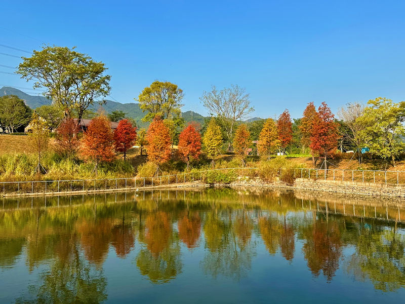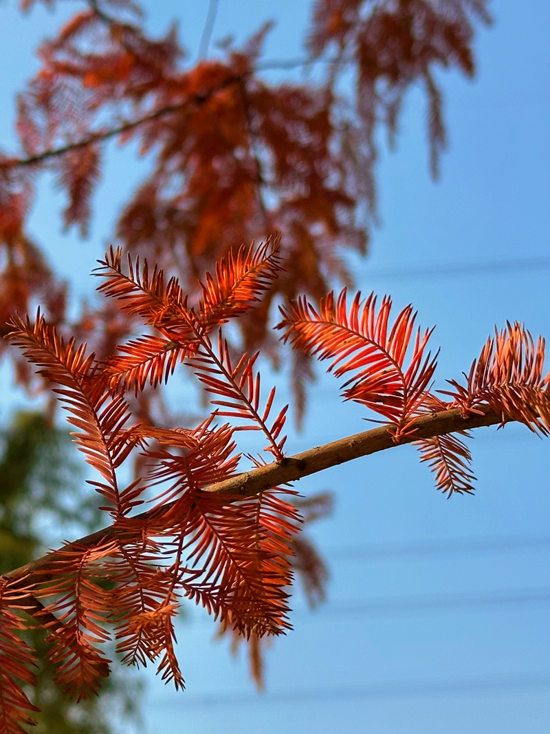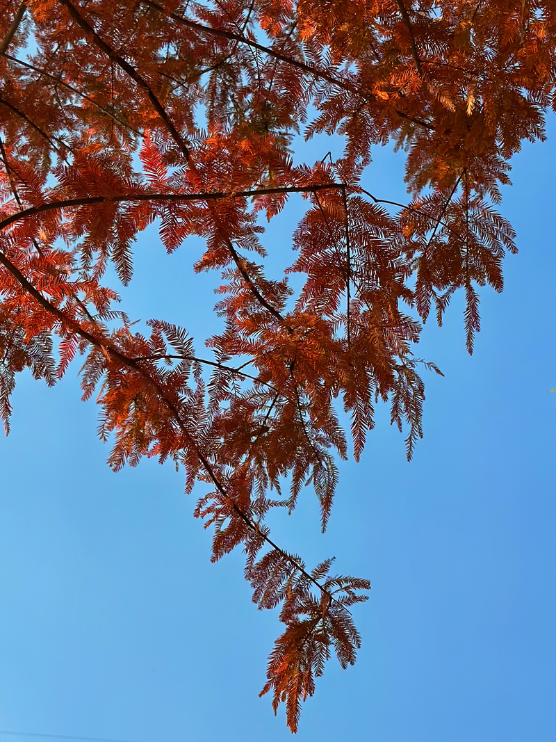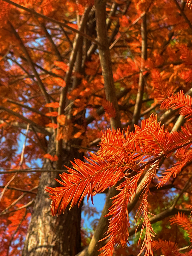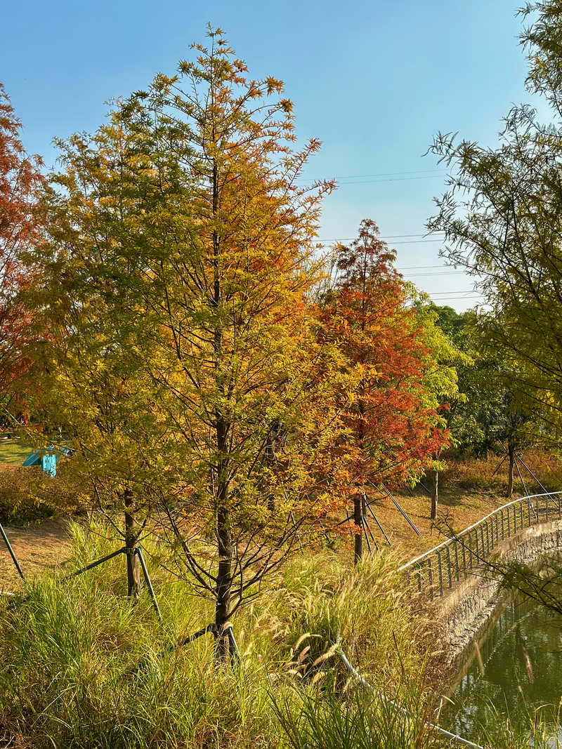 这里的落羽杉红、橙、黄、绿层层晕染,呈现出一种如梦如幻的渐变效果。每一棵树都像是一个独立的艺术个体,又共同构成了一幅绚丽多彩的秋日盛景。