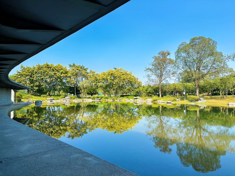 水面倒映着蓝天、远山与绿树,与周边的树木、池塘相映成趣,构成一幅错落有致的景致。