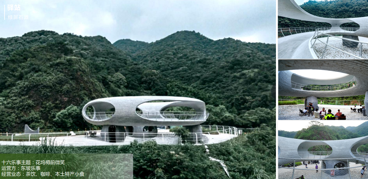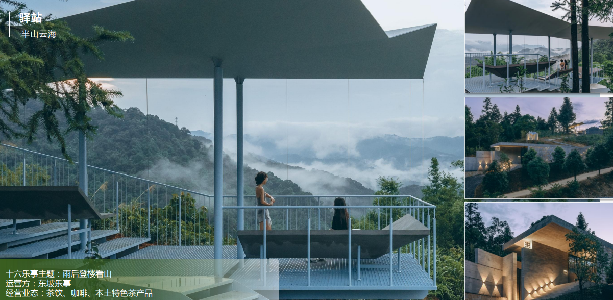 16个驿站都引入国际、国内知名设计师、建筑师以高标准、高规格进行设计;并以苏东坡人生16件乐事打造东坡乐事文化IP,对驿站进行美学赋能和文化赋能,每一个驿站都有一个对应的东坡乐事主题。