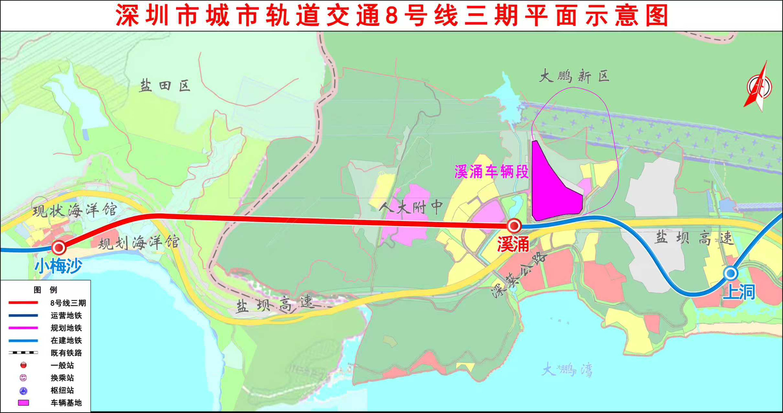 地铁8号线三期起于小梅沙站,止于溪涌站,全长3.69公里,共设溪涌站1座及1个区间,并同步建设1个溪涌车辆基地。