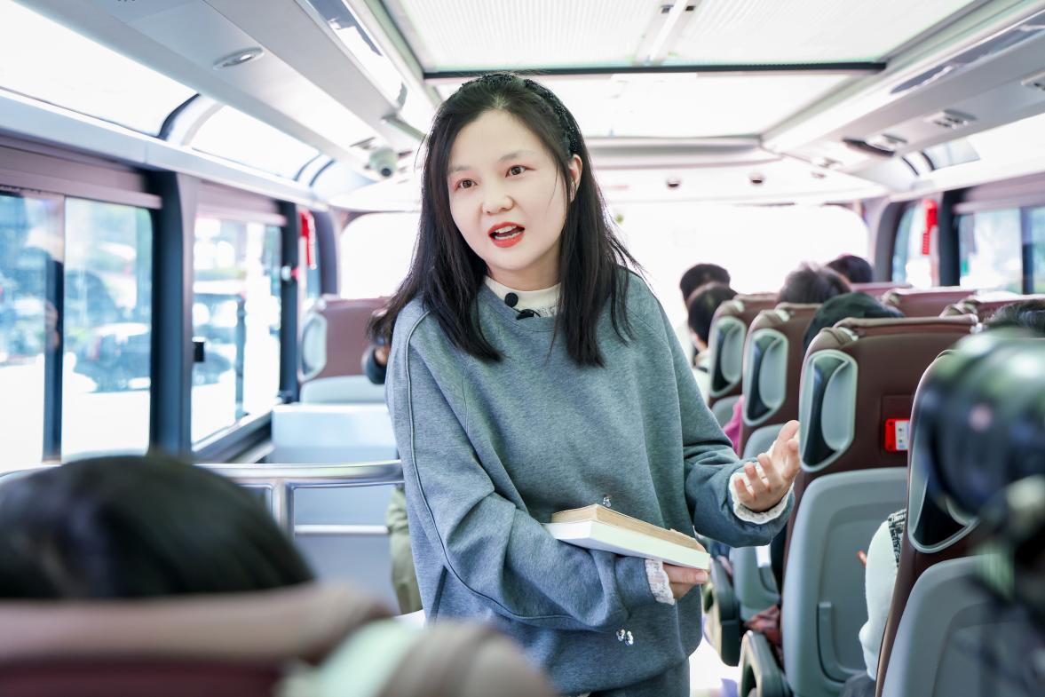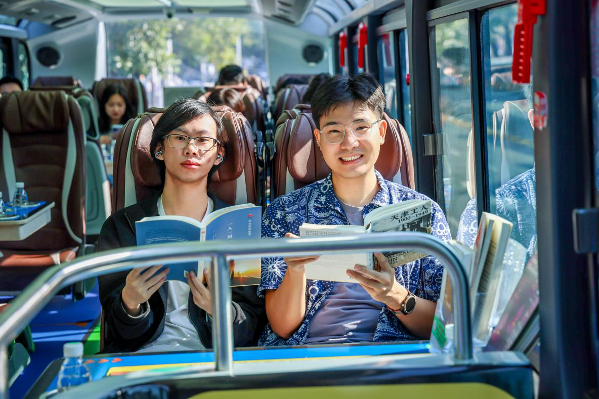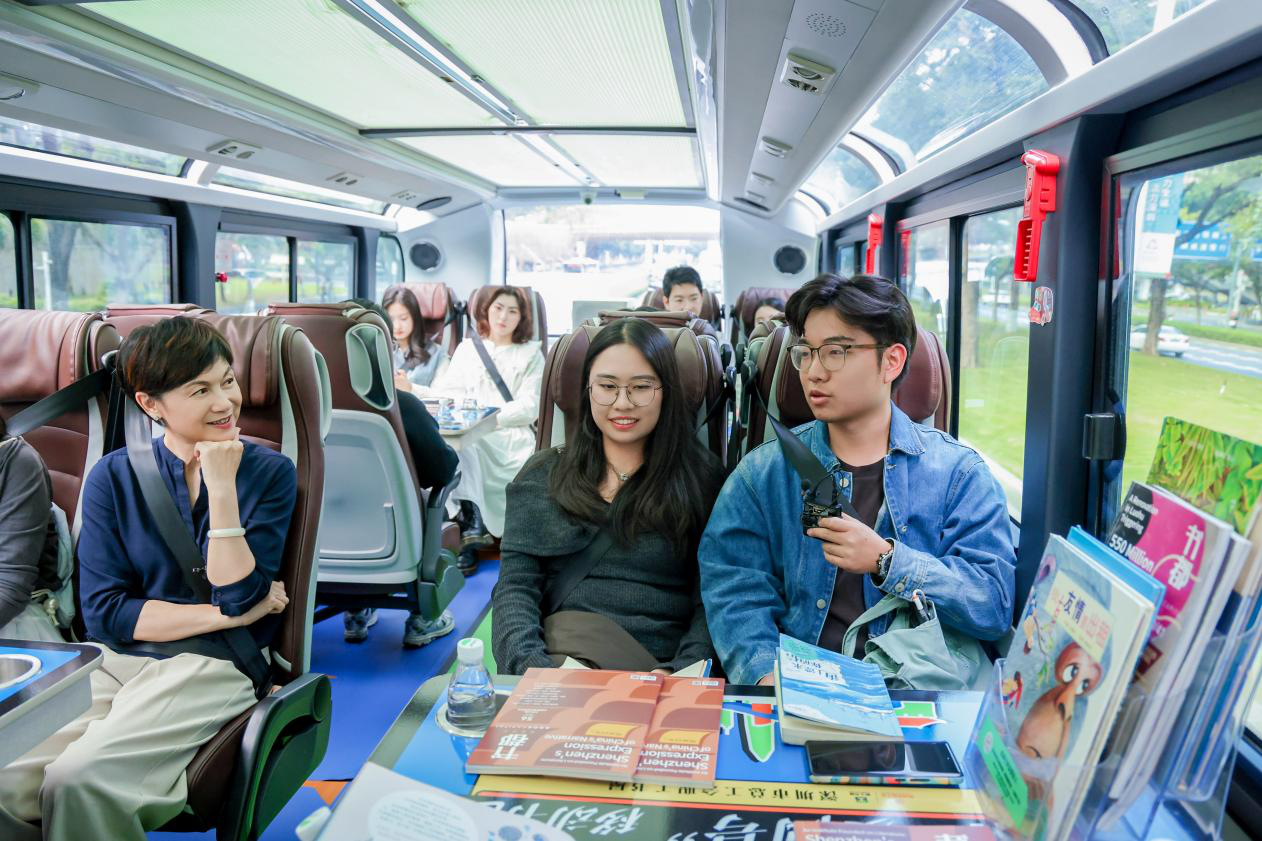 随着“爱阅号”缓缓穿行,青年们在流动的风景中感受着深圳独特的人文脉动。车辆沿途经过湾区之眼、白鹭坡书吧等文化地标,窗外掠过的是山海相连的城市天际线,车内洋溢的是书香与笑语。央视《读书》栏目主持人李潘与来自五湖四海的青年齐聚畅谈,话题从初到深圳时的忐忑与憧憬展开,聊起奋斗的日夜、在职场突破的瞬间,又落脚到那些曾给予他们力量的书籍。不同的人生轨迹与书籍故事相互交织,思想在交流中碰撞。