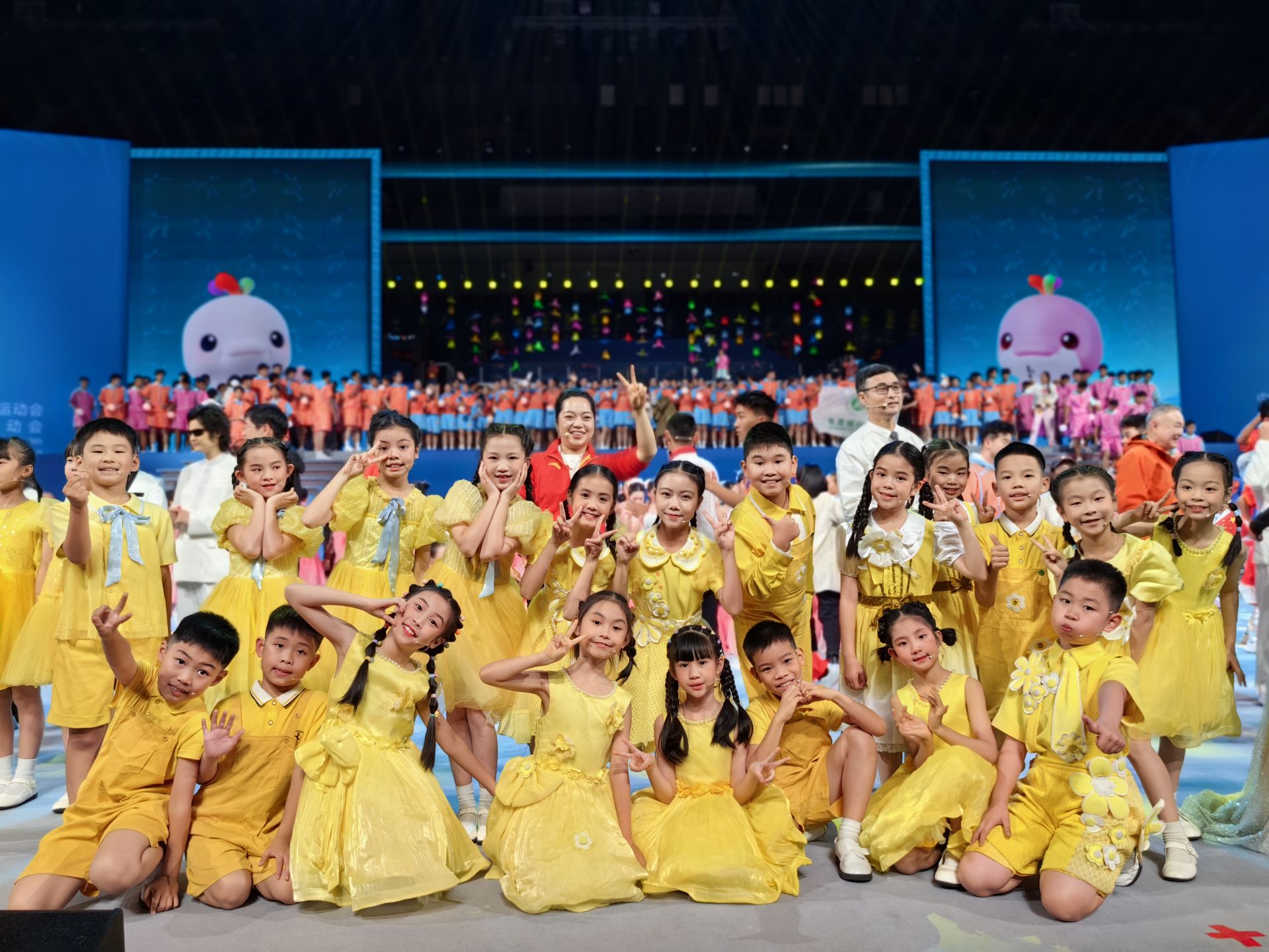 闭幕活动上,来自深圳市南山区蛇口学校五彩石合唱团的20名学生与深圳市元平特殊教育学校学生蔡晓露同台,在庄严的“迎国旗”仪式中深情献唱《我和我的祖国》,以纯净童声致敬体育精神,传递家国情怀。