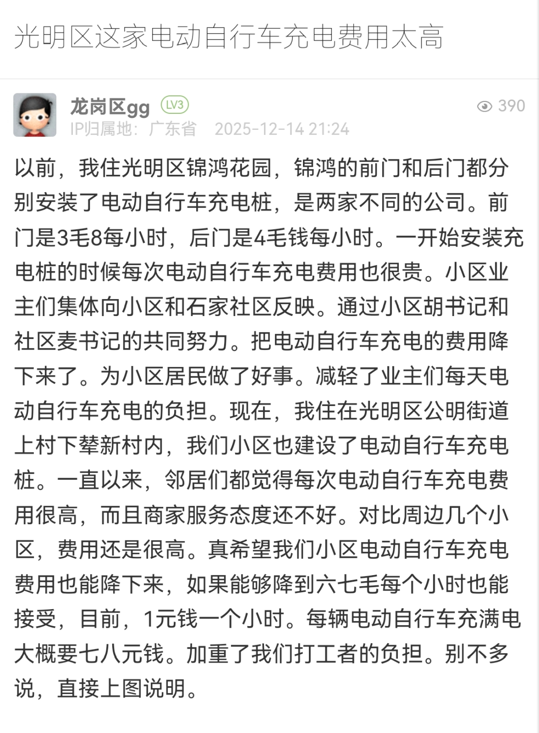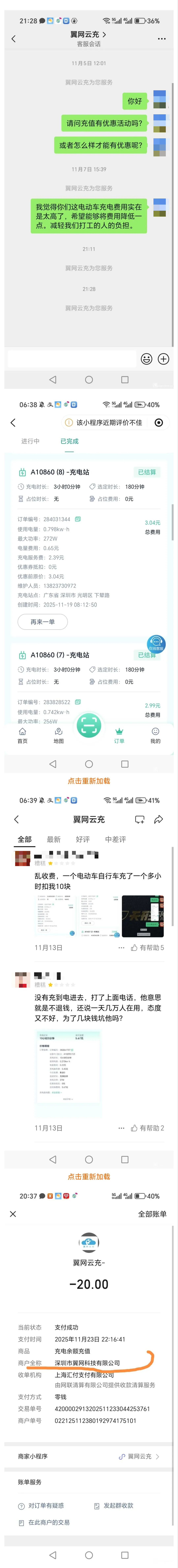 近日,有市民在《问政深圳》发帖称,电动自行车充电费用太高,质疑乱扣费,并贴出了多张收费记录。