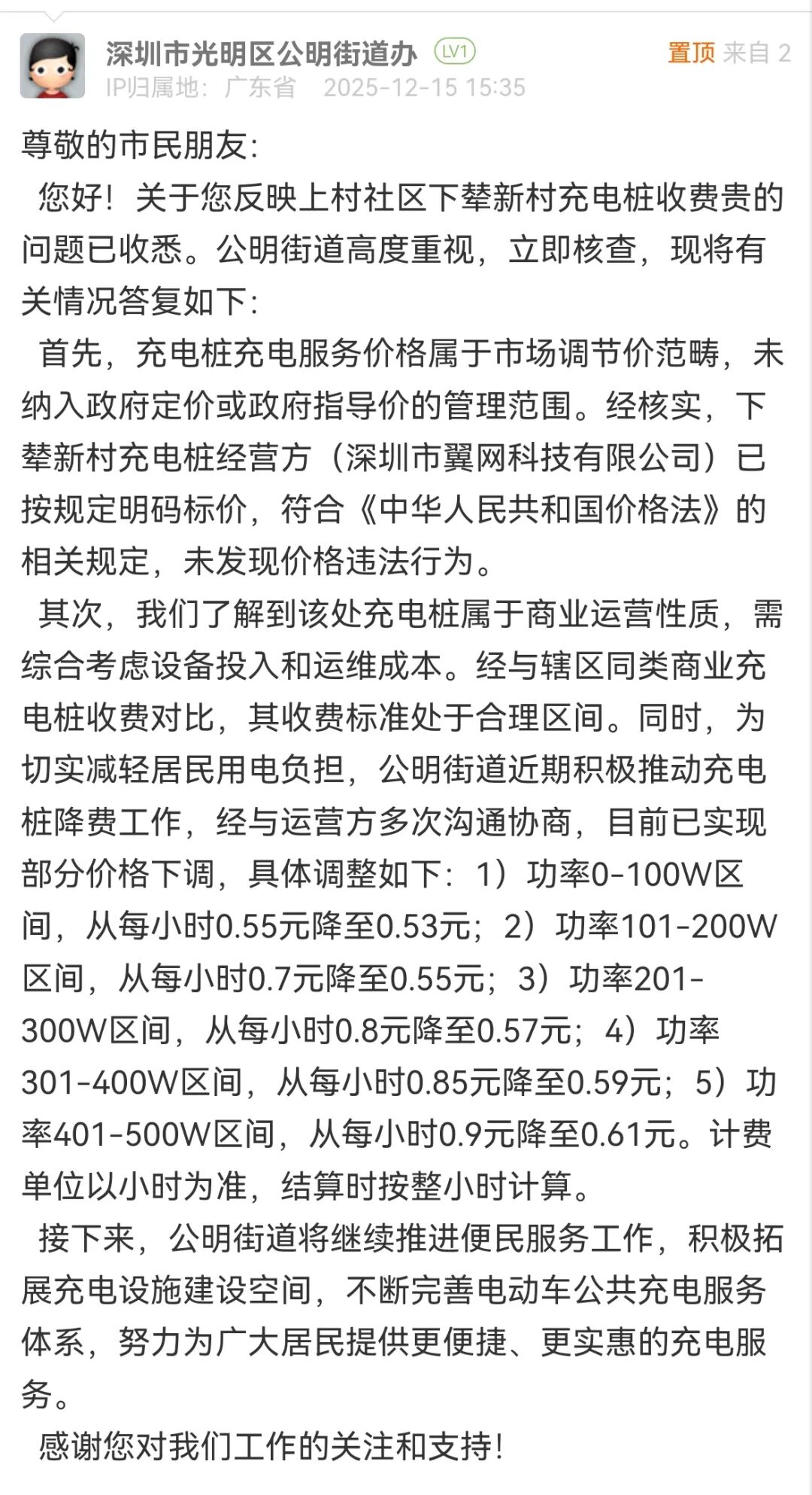 光明区公明街道办表示,已了解到该处充电桩属于商业运营性质,需综合考虑设备投入和运维成本。经与辖区同类商业充电桩收费对比,其收费标准处于合理区间。同时,为切实减轻居民用电负担,公明街道近期积极推动充电桩降费工作,经与运营方多次沟通协商,目前已实现部分价格下调,具体调整如下: