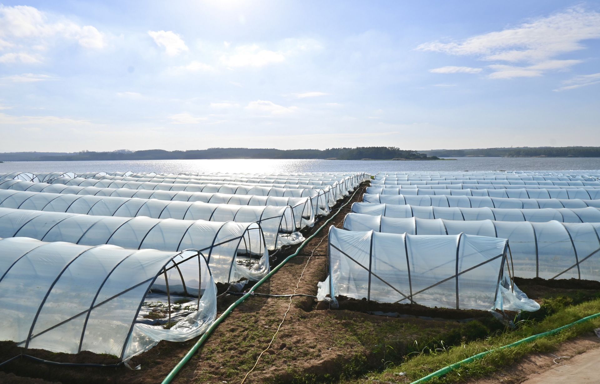 驱车穿行王五镇的田野,远方的春江水库波光粼粼。目光所及,种植蔬果的大棚连接成片,覆盖在四周的山头与田野之间,一直延伸至水库边。在另一侧的土地上,绿油油的毛豆已经结出果实,到月底就将开启大规模采摘,“我们聘请当地农民采摘,每斤采摘费用0.6元,熟练工每天可以摘六七百斤。再加上每亩地六七百元的年租金,一次支付三年,农民到手的收入远超过自己种地。”