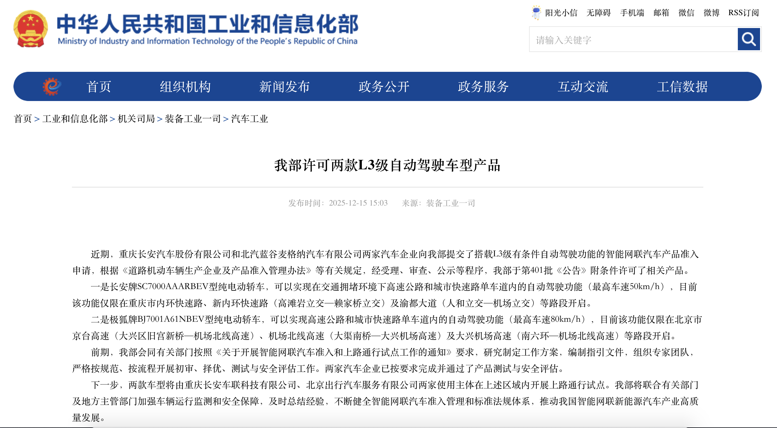 2024年6月,工信部公布智能网联汽车准入和上路通行试点名单,长安、北汽蓝谷等9家车企入选。2025年12月15日,工业和信息化部正式许可两款L3级自动驾驶车型产品。