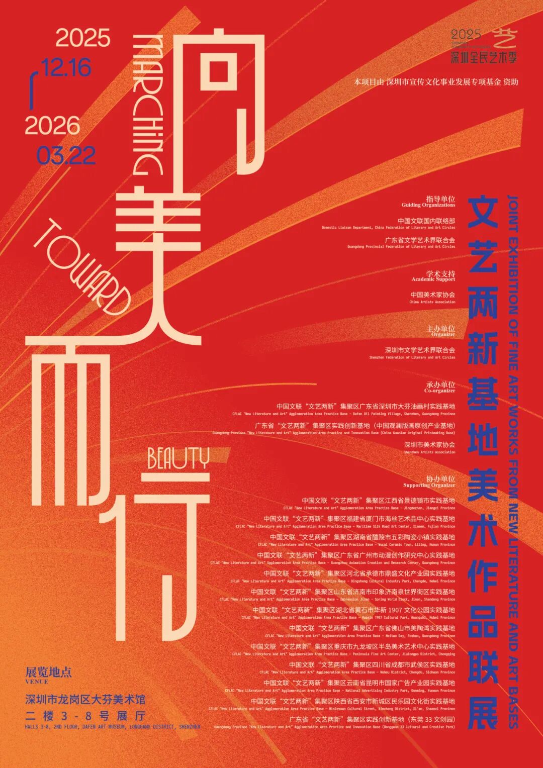 据悉,该展由中国文联国内联络部、广东省文学艺术界联合会指导,中国美术家协会担任学术支持,深圳市文学艺术界联合会主办,中国文联“文艺两新”集聚区广东省深圳市大芬油画村实践基地、广东省“文艺两新”集聚区实践创新基地(中国观澜版画原创产业基地)、深圳市美术家协会承办,将持续至2026年3月22日。