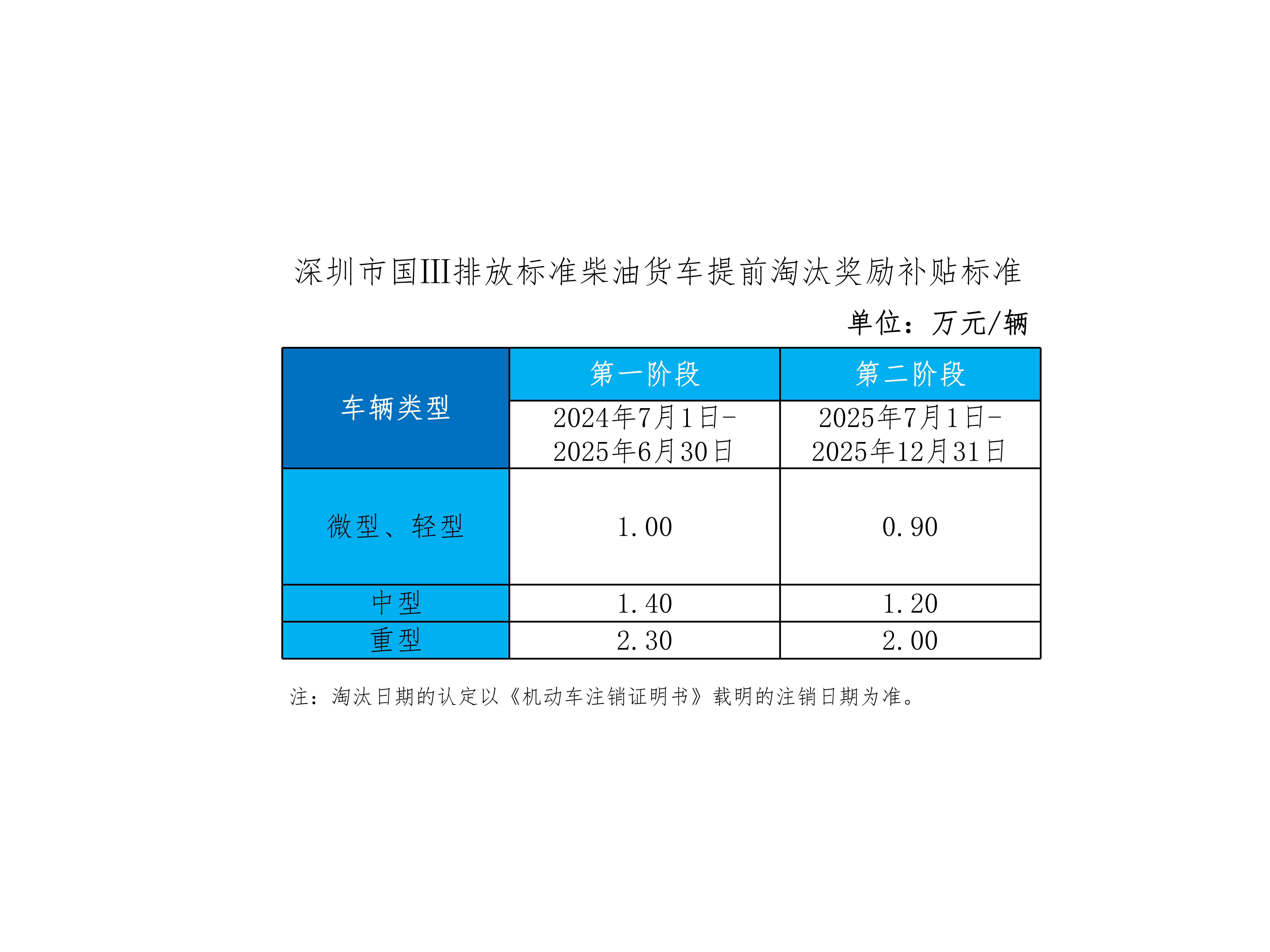 按照补贴办法规定,深圳注册登记的国Ⅲ柴油货车如果在规定时间内完成淘汰,且淘汰时距离强制报废年限一年及以上,可申领相应补贴。请注意,淘汰日期以《机动车注销证明书》载明的注销日期为准。
