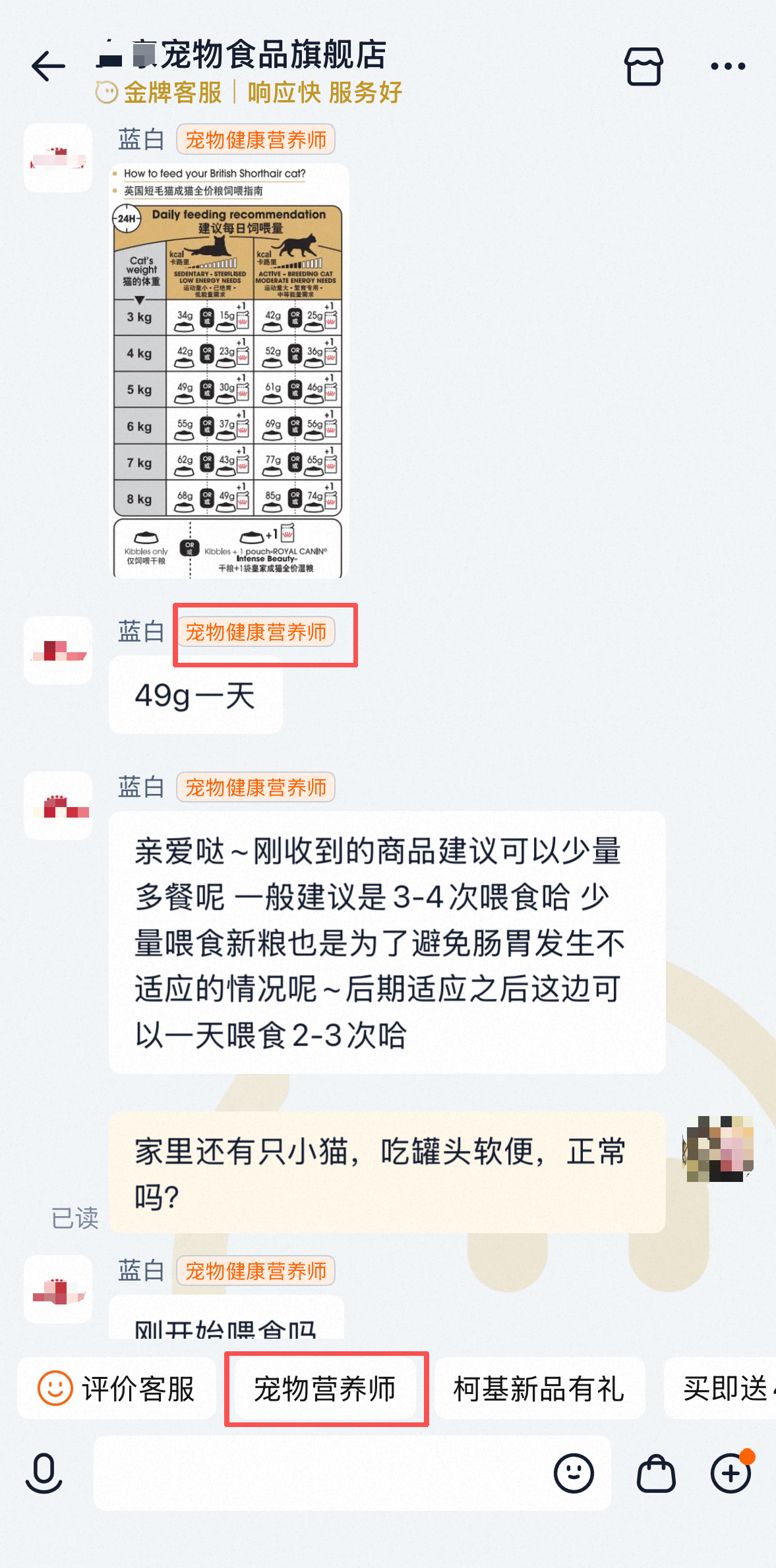 在一家参与试点的宠物食品旗舰店,记者点击“联系客服”后手动选择“宠物营养师”入口,系统随即匹配了标注“宠物健康营养师”资质的人工客服,记者先后提出两个典型问题:一是“幼猫食用主食罐后出现软便是否正常”,二是“成年猫的体重超过5公斤是否偏胖,能否使用减肥粮”。