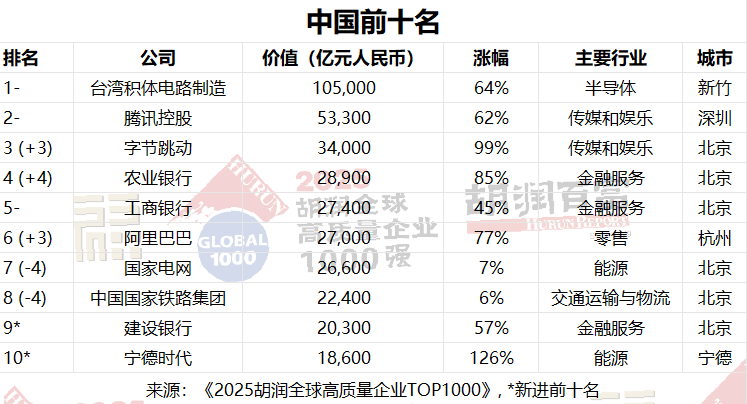 英伟达的异军突起堪称年度最震撼的商业叙事。49%的价值增幅、10.8万亿元的增量贡献,背后是人工智能芯片与数据中心计算需求的爆炸式增长。这并非孤立现象。博通以118%的涨幅跻身前十,台积电增长64%坐稳第九,Alphabet凭借AI驱动的广告业务实现48%的暴涨。前十大企业中八家扎根先进技术,印证了胡润的判断——“人工智能价值首先在算力领域产生,继而渗透软件与消费电子”。