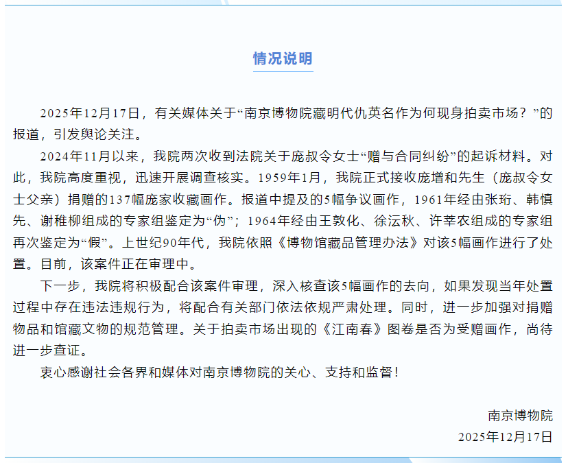 2025年12月17日,有关媒体关于“南京博物院藏明代仇英名作为何现身拍卖市场?”的报道,引发舆论关注。