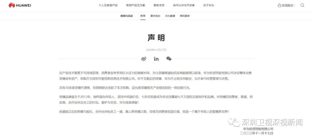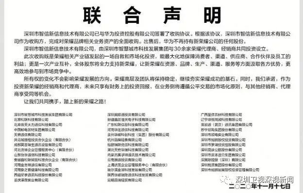 11月17日早上,多家企业在深圳本地媒体上发布联合声明,深圳市智信新信息技术有限公司已与华为投资控股有限公司签署了收购协议,完成对荣耀品牌相关业务资产的全面收购。