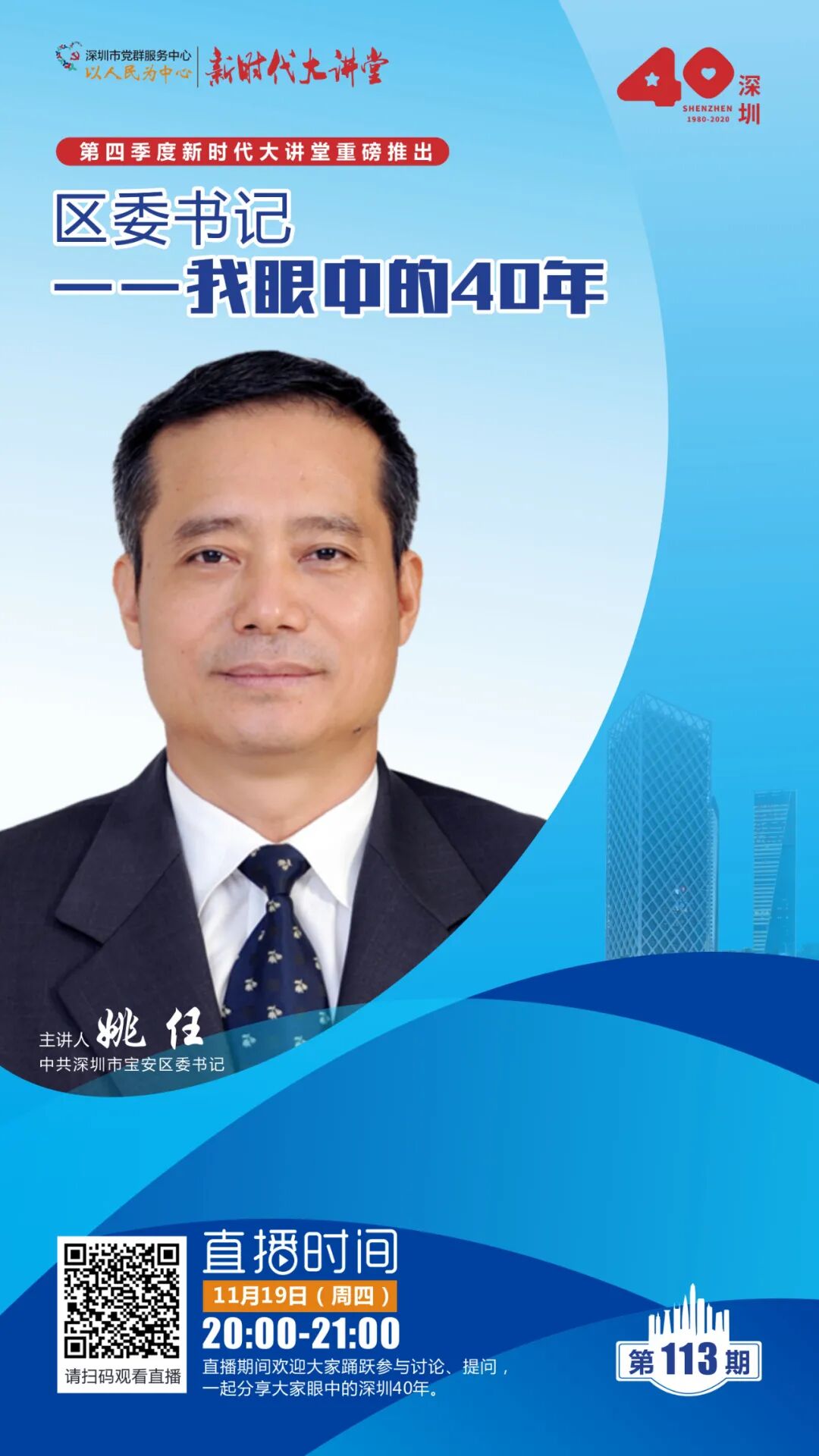 11月19日第113期新时代大讲堂,我们邀请到宝安区委书记姚任作为主讲嘉宾,讲述宝安在深圳经济特区建立40周年重要节点和“双区”建设中的历史使命。