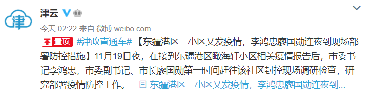 11月19日夜,在接到东疆港区瞰海轩小区相关疫情报告后,天津市委书记李鸿忠,市委副书记、市长廖国勋第一时间赶往该社区封控现场调研检查,研究部署疫情防控工作。