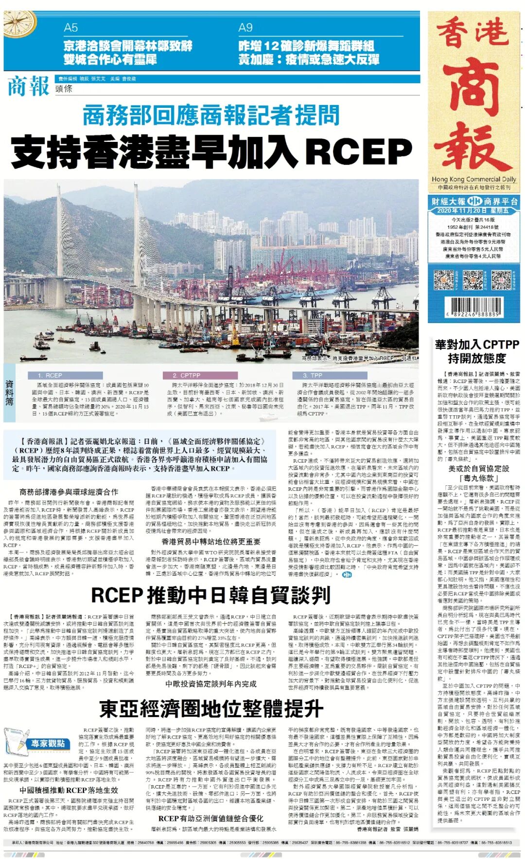 日前,《区域全面经济伙伴关系协定》(RCEP)历经8年谈判终成正果,标志着当前世界上人口最多、经贸规模最大、最具发展潜力的自由贸易区正式启航。香港各界亦呼吁港府积极申请加入有关协定。19日,国家商务部应询香港商报时表示,支持香港尽早加入RCEP。