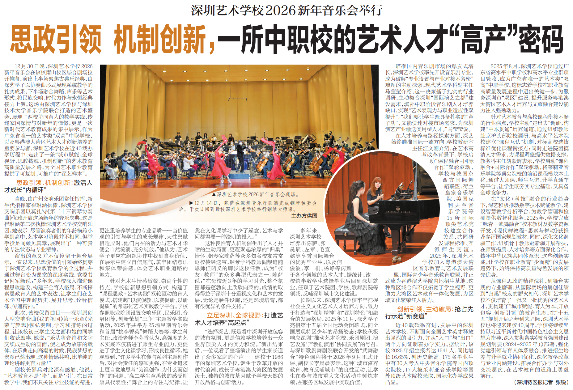12月30日晚,深圳艺术学校2026新年音乐会在该校南山校区综合剧场拉开帷幕。演出上半场聚焦古典乐经典,由深艺学子以协奏曲形式展现系统教学的扎实成果,下半场融合舞蹈、声乐等艺术形式,将民族交响、时代力作与永恒经典接力上演。这场由深圳艺术学校与深圳技术大学音乐学院联合打造的艺术盛会,展现了两校协同育人的教学实践,传递家国深情与对新年的憧憬,更是一次新时代艺术教育成果的集中展示。作为广东省唯一的艺术类“双高”中职学校,以及粤港澳大湾区艺术人才创新培养的重要参与者,深圳艺术学校在近40载办学历程中,走出了一条“城市赋能、全球视野、思政铸魂、机制创新”的艺术教育高质量发展之路,为全国艺术职业教育提供了可复制、可推广的“深艺样本”。