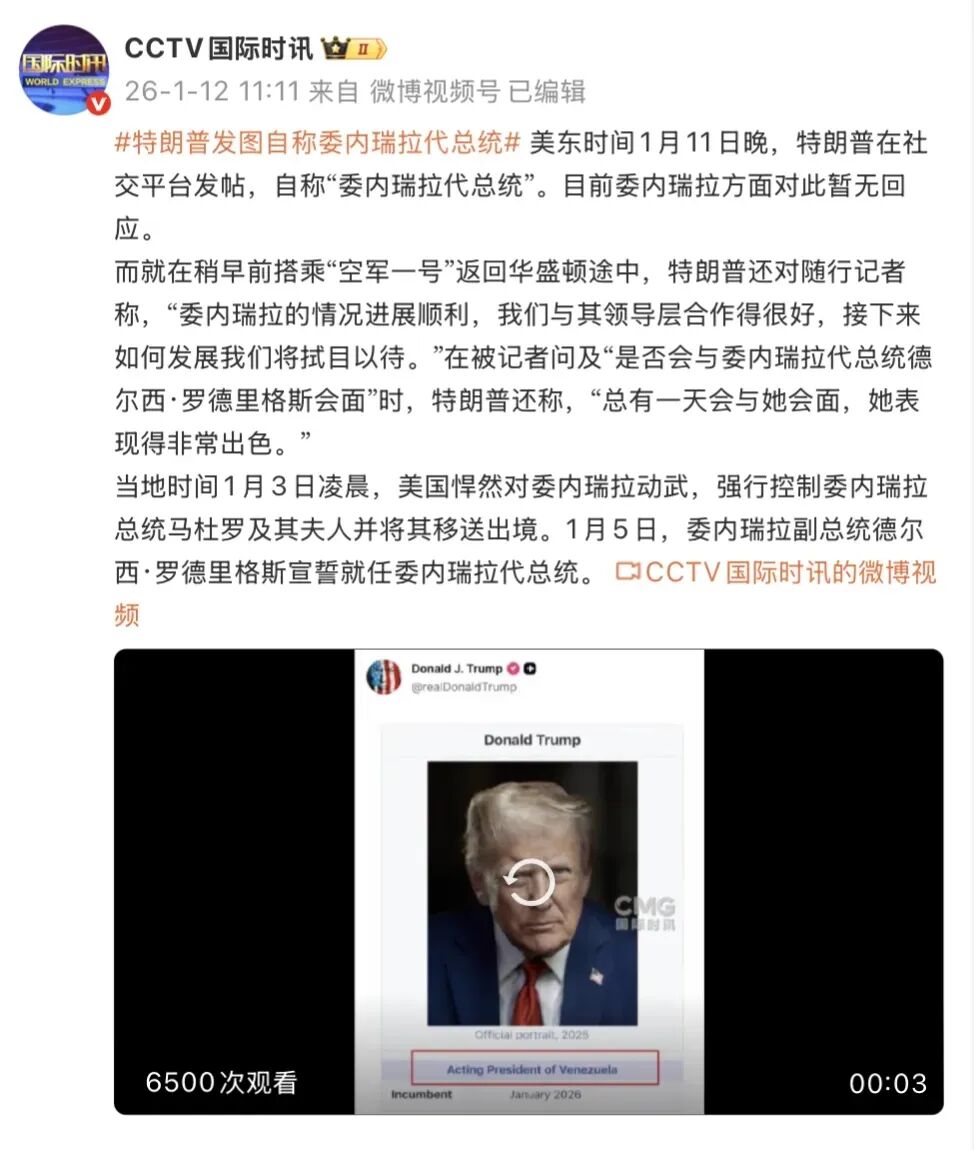 据CCTV国际时讯,特朗普美东时间1月11日晚在社交平台发帖,自称“委内瑞拉代总统”。目前委内瑞拉方面对此暂无回应。