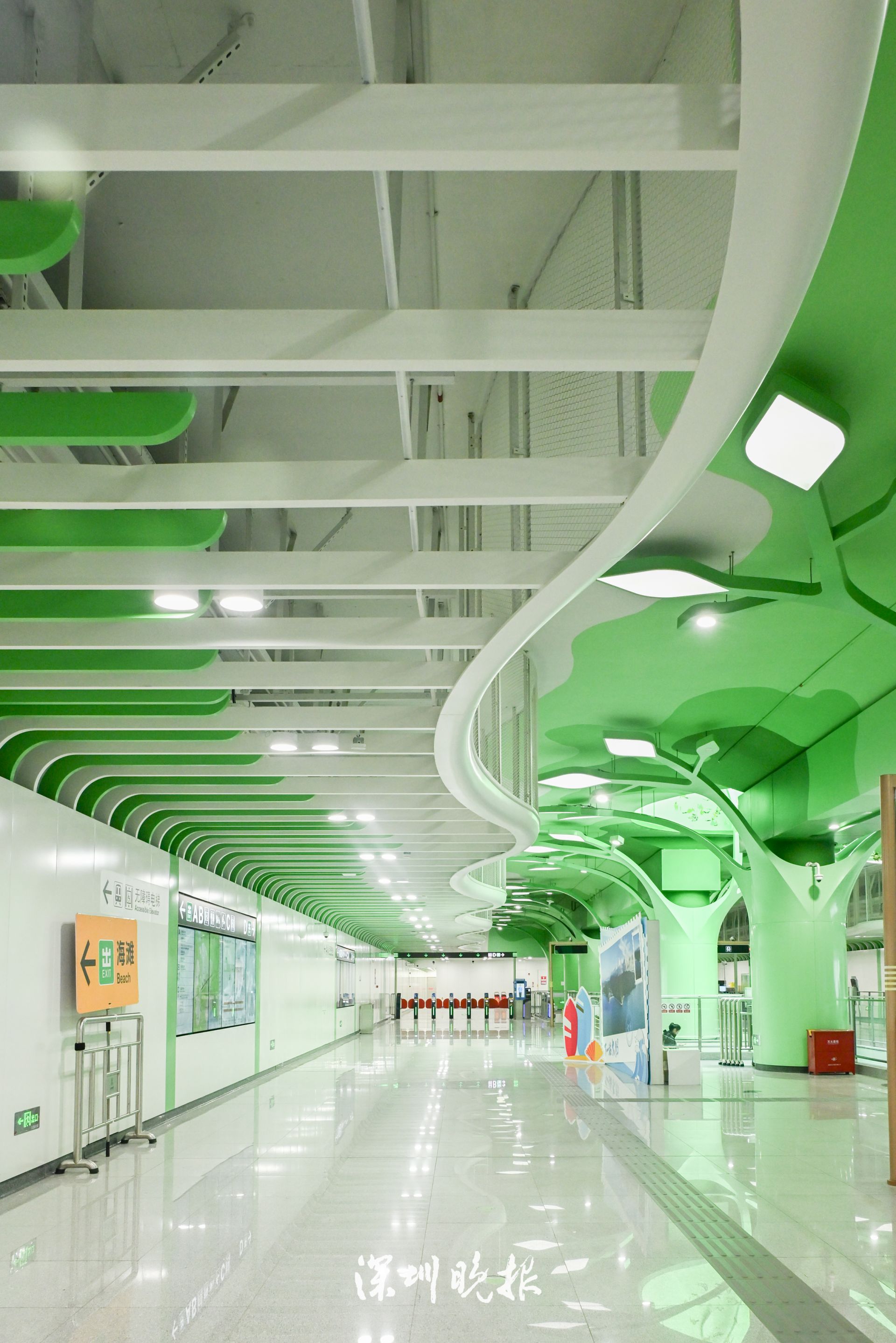 清新亮丽的溪涌地铁站,先给游客亿点点惊喜!站内设计以绿色为基调,巧妙将古树的意象融入建筑与灯光,旺盛的生命力扑面而来。