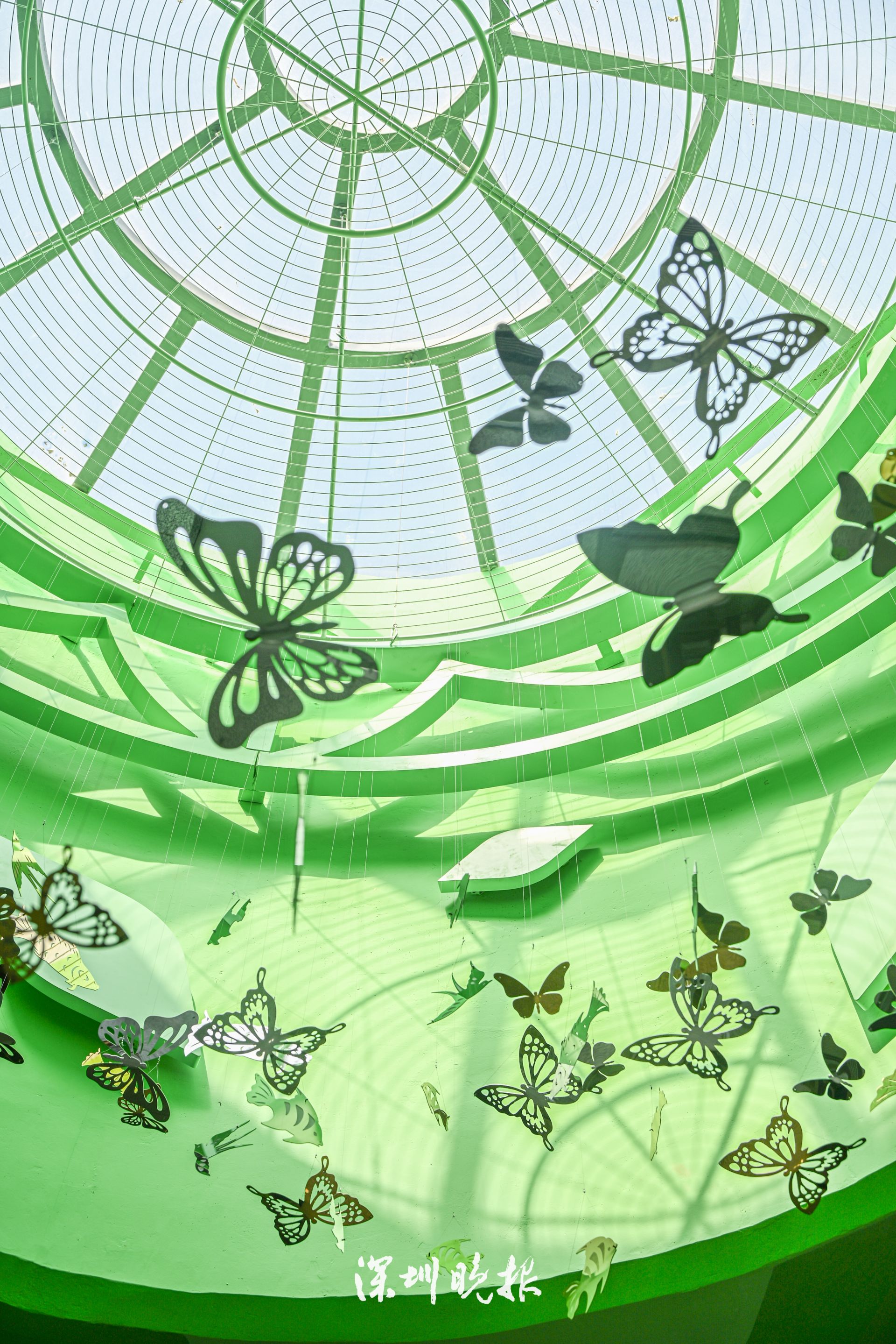 站内的中庭处设有透光天窗,光线舒展铺洒,悬空的蝴蝶亮片随着光影韵律翩翩飞舞。