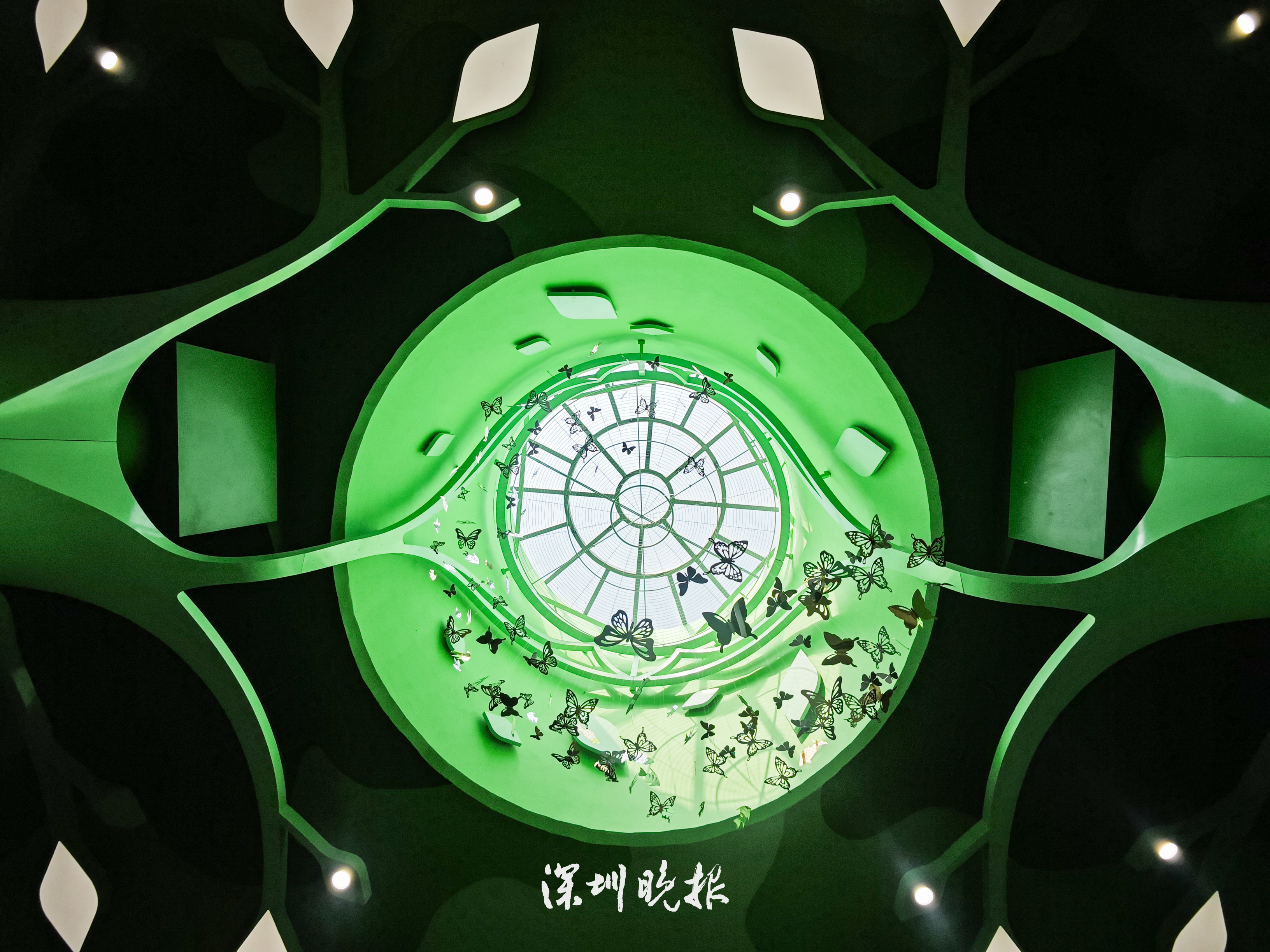 站内的中庭处设有透光天窗,光线舒展铺洒,悬空的蝴蝶亮片随着光影韵律翩翩飞舞。