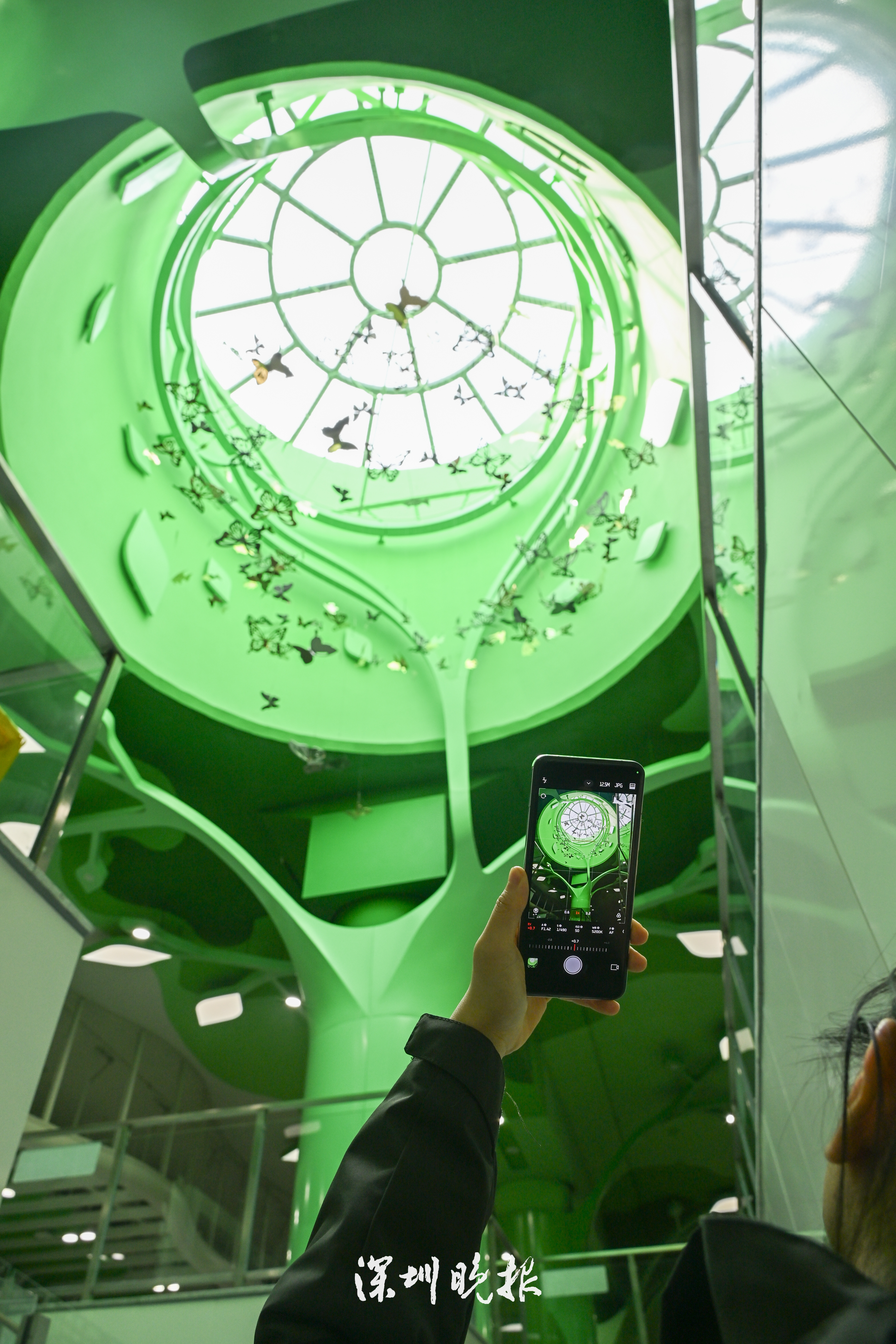 站内的中庭处设有透光天窗,光线舒展铺洒,悬空的蝴蝶亮片随着光影韵律翩翩飞舞。