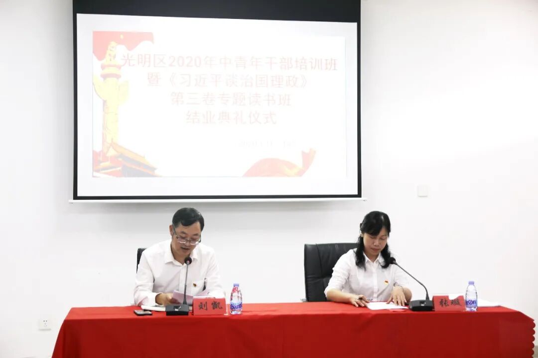 11月19日上午,光明区2020年中青年干部培训班暨《习近平谈治国理政》第三卷专题读书班结业典礼仪式在光明区委党校举行。区委组织部副部长刘凯、区委党校副校长张璇出席仪式,并为学员们颁发结业证书和优秀学员证书。