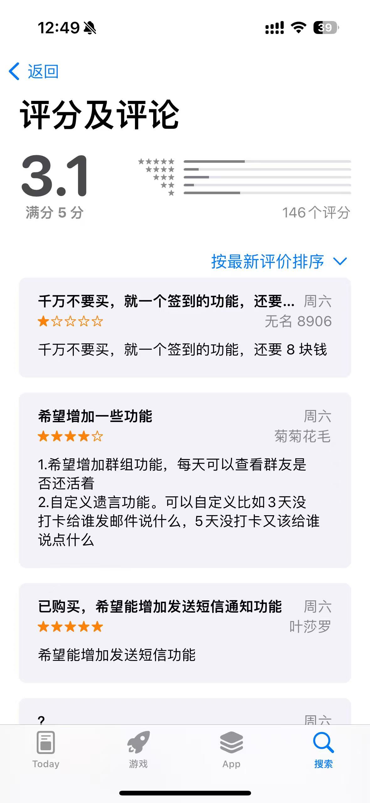 12日,记者从苹果应用商店的工具选项里看到,在付费排行榜上,“死了么”APP高居第一,下载费用8元。其介绍说明是“为独居人群打造的轻量化安全工具,通过签到监测与紧急联络机制,构建无感化安全防护,让独处生活更安心。”记者实测发现,该软件页面功能简洁,无需复杂注册,仅需输入姓名与紧急联系人邮箱,每日点击首页显眼的 “签到” 按钮即可完成操作。若连续 2 日未签到,系统将自动向紧急联系人发送预警邮件,提示 “用户已连续 2 日未签到,请注意核实安全情况”。 截至中午12点49分,该软件有146个评分,评分为3.1(满分5分)。记者发现有大量评论认为国内邮件即时查看率不高,建议增加电话、短信或者微信服务号通知功能。