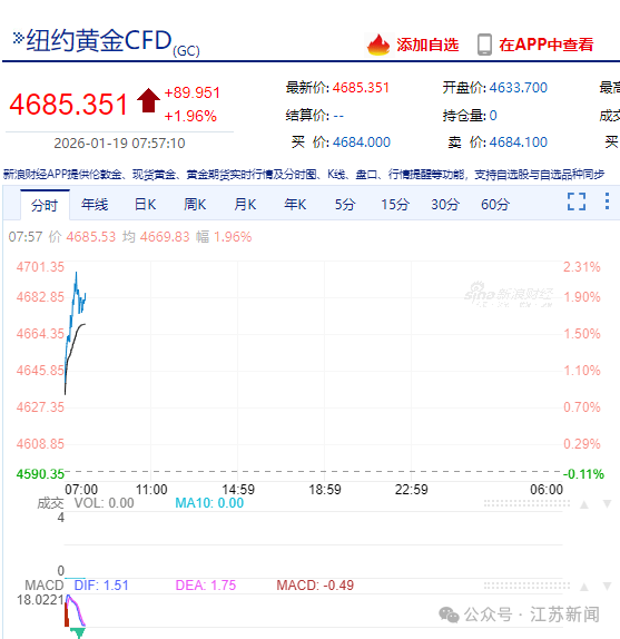 1月19日,金价跃升至纪录高位,纽约期金突破4670美元/盎司,日内涨1.62%。现货黄金一度突破突破4690美元/盎司,日内涨2.06%,突破历史新高。截至发稿报4685.351美元/盎司,日内涨1.96%。